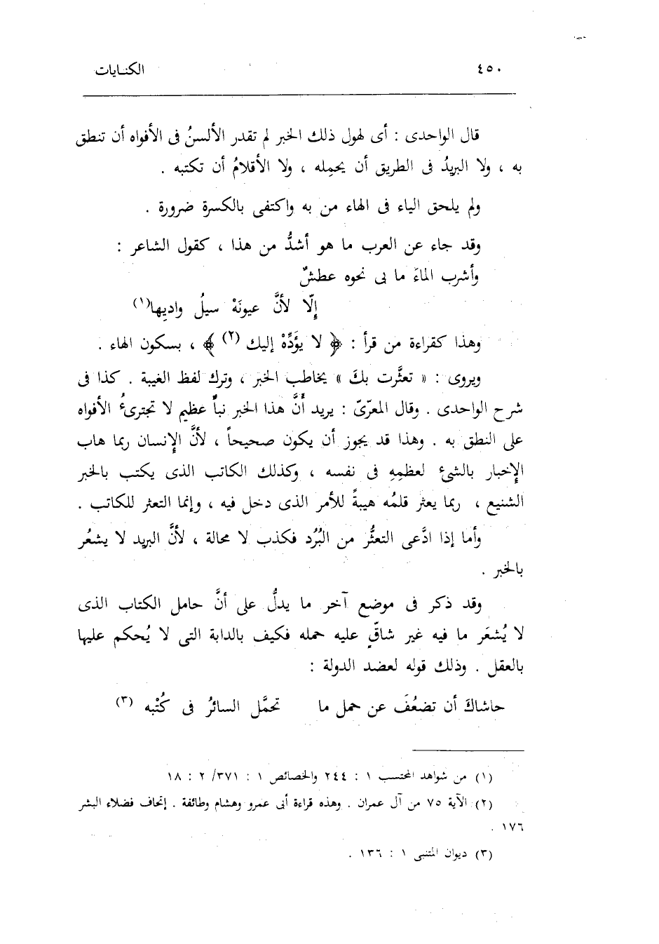وَهَذَا كَقِرَاءَة من قَرَأَ: لَا يؤده إِلَيْك بِسُكُون الْهَاء. ويروى: تعثرت بك يُخَاطب الْخَبَر وَترك لفظ الْغَيْبَة. كَذَا فِي شرح الواحدي. وَقَالَ المعري: يُرِيد أَن هَذَا الْخَبَر نبأٌ عَظِيم لَا تجترئ الأفواه على النُّطْق بِهِ. وَهَذَا قد يجوز أَن يكون صَحِيحا لِأَن الْإِنْسَان رُبمَا هاب الْإِخْبَار بالشَّيْء لعظمه فِي نَفسه وَكَذَلِكَ الْكَاتِب الَّذِي يكْتب بالْخبر الشنيع رُبمَا يعثر قلمه هَيْبَة لِلْأَمْرِ الَّذِي دخل فِيهِ وَإِنَّمَا التعثر لِلْكَاتِبِ. وَأما إِذا ادّعى التعثر من الْبرد فكذب لَا محَالة لِأَن الْبَرِيد لَا يشْعر بالْخبر.