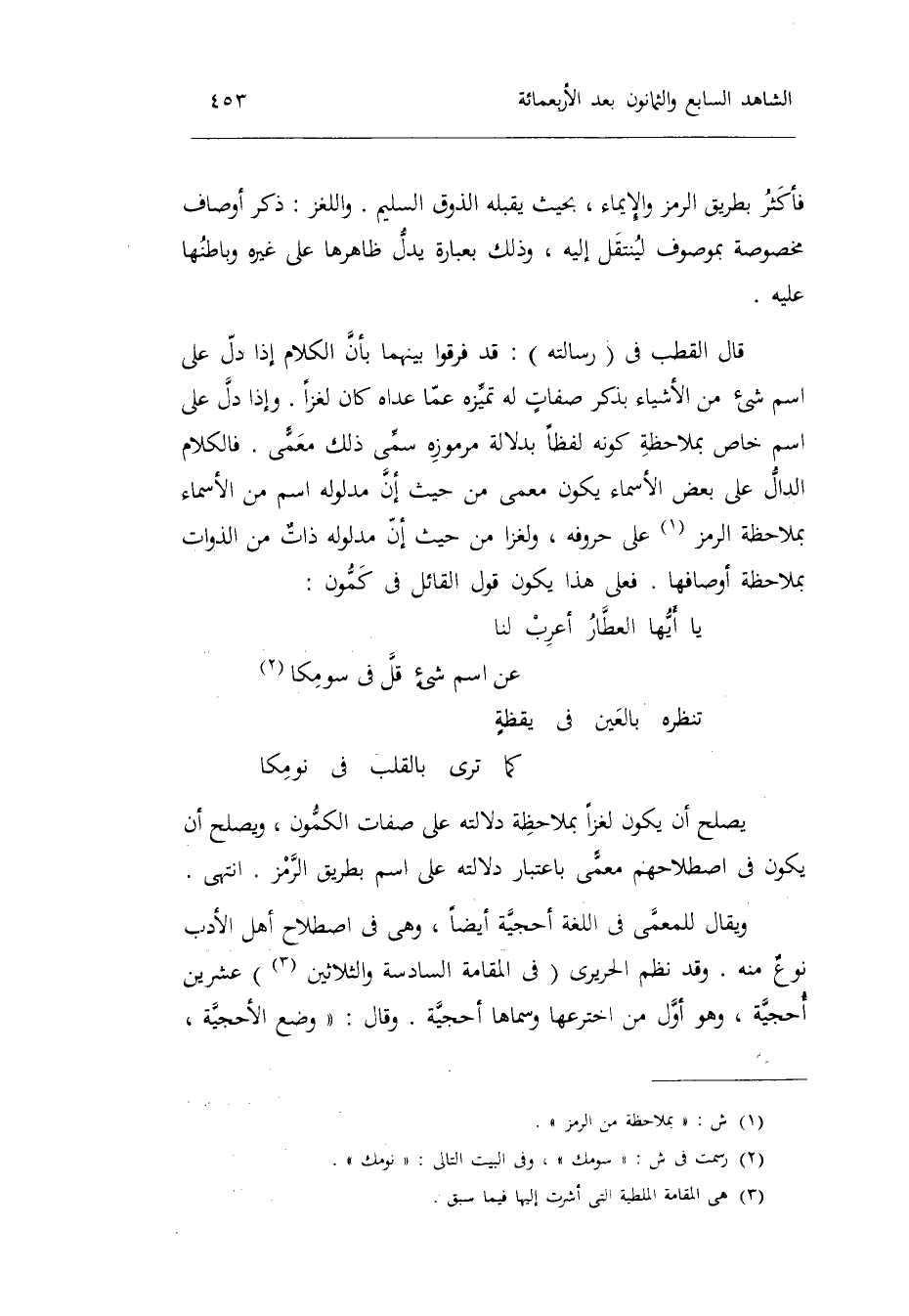 قَالَ القطب فِي رسَالَته: قد فرقوا بَينهمَا بِأَن الْكَلَام إِذا دلّ على اسْم شَيْء من الْأَشْيَاء بِذكر صفاتٍ لَهُ تميزه عَمَّا عداهُ كَانَ لغزاً. وَإِذا دلّ على اسْم خَاص بملاحظة كَونه لفظا بِدلَالَة مرموزه سمي ذَلِك معمًّى. فَالْكَلَام الدَّال على بعض السَّمَاء يكون معمى من حَيْثُ أَن مَدْلُوله اسْم من الْأَسْمَاء بملاحظة الرَّمْز على حُرُوفه ولغزاً من حَيْثُ أَن مَدْلُوله ذاتٌ من الذوات بملاحظة أوصافها. فعلى هَذَا يكون قَول الْقَائِل فِي كمون: