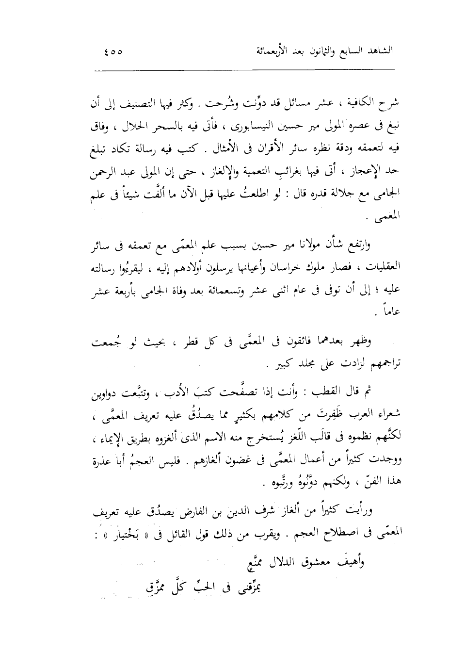 شرح الكافية عشر مسَائِل قد دونت وشرحت. وَكثر فِيهَا التصنيف إِلَى أَن نبغ فِي عصره الْمولى مير حُسَيْن النَّيْسَابُورِي فَأتى فِيهِ بِالسحرِ الْحَلَال وفَاق فِيهِ لتعمقه ودقة نظره سَائِر الأقران فِي الْأَمْثَال. كتب فِيهِ رِسَالَة تكَاد تبلغ حد الإعجاز أَتَى فِيهَا بِغَرَائِب التعمية والإلغاز حَتَّى إِن الْمولى عبد الرَّحْمَن الجامي مَعَ جلالة قدره قَالَ: لَو اطَّلَعت عَلَيْهَا قبل الْآن مَا ألفت شَيْئا فِي علم المعمى. وارتفع شَأْن مَوْلَانَا مير حُسَيْن بِسَبَب علم المعمى مَعَ تعمقه فِي سَائِر العقليات فَصَارَ مُلُوك خُرَاسَان وأعيانها يرسلون أَوْلَادهم إِلَيْهِ ليقرؤوا رسَالَته عَلَيْهِ إِلَى أَن توفّي فِي عَام اثْنَي عشر وَتِسْعمِائَة بعد وَفَاة الجامي بأَرْبعَة عشر عَاما. وَظهر بعدهمَا فائقون فِي المعمى فِي كل قطر بِحَيْثُ لَو جمعت تراجمهم لزادت على مُجَلد كَبِير. ثمَّ قَالَ القطب: وَأَنت إِذا تصفحت كتب الْأَدَب وتتبعت دواوين شعراء الْعَرَب ظَفرت من كَلَامهم بكثيرٍ مِمَّا يصدق عَلَيْهِ تَعْرِيف المعمى لكِنهمْ نظموه فِي قالب اللغز يسْتَخْرج مِنْهُ الِاسْم الَّذِي ألغزوه بطرِيق الْإِيمَاء وَوجدت كثيرا من أَعمال المعمى فِي غُضُون ألغازهم. فَلَيْسَ الْعَجم أَبَا عذرة هَذَا الْفَنّ وَلَكنهُمْ دونوه ورتبوه. وَرَأَيْت كثيرا من ألغاز شرف الدَّين بن الفارض يصدق عَلَيْهِ تَعْرِيف المعمى فِي اصْطِلَاح الْعَجم. وَيقرب من ذَلِك قَول الْقَائِل فِي بختيار: