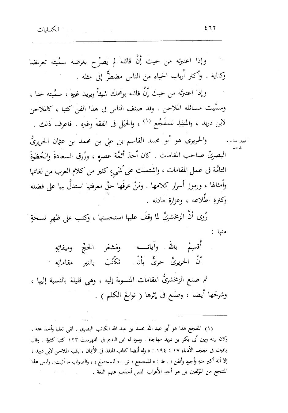للمفجع والحيل فِي الْفِقْه وَغَيره. فاعرف ذَلِك. والحريري هُوَ أَبُو مُحَمَّد الْقَاسِم بن عَليّ بن مُحَمَّد بن عُثْمَان الحريري الْبَصْرِيّ صَاحب المقامات. كَانَ أحد أَئِمَّة عصره ورزق السَّعَادَة والحظوة التَّامَّة فِي عمل المقامات واشتملت على شيءٍ كثير من كَلَام الْعَرَب من لغاتها وأمثالها ورموز أسرار كَلَامهَا. وَمن عرفهَا حق مَعْرفَتهَا اسْتدلَّ بهَا على فَضله وَكَثْرَة اطِّلَاعه وغزارة مادته. رُوِيَ أَن الزَّمَخْشَرِيّ لما وقف عَلَيْهَا استحسنها وَكتب على ظهر نسخةٍ مِنْهَا: