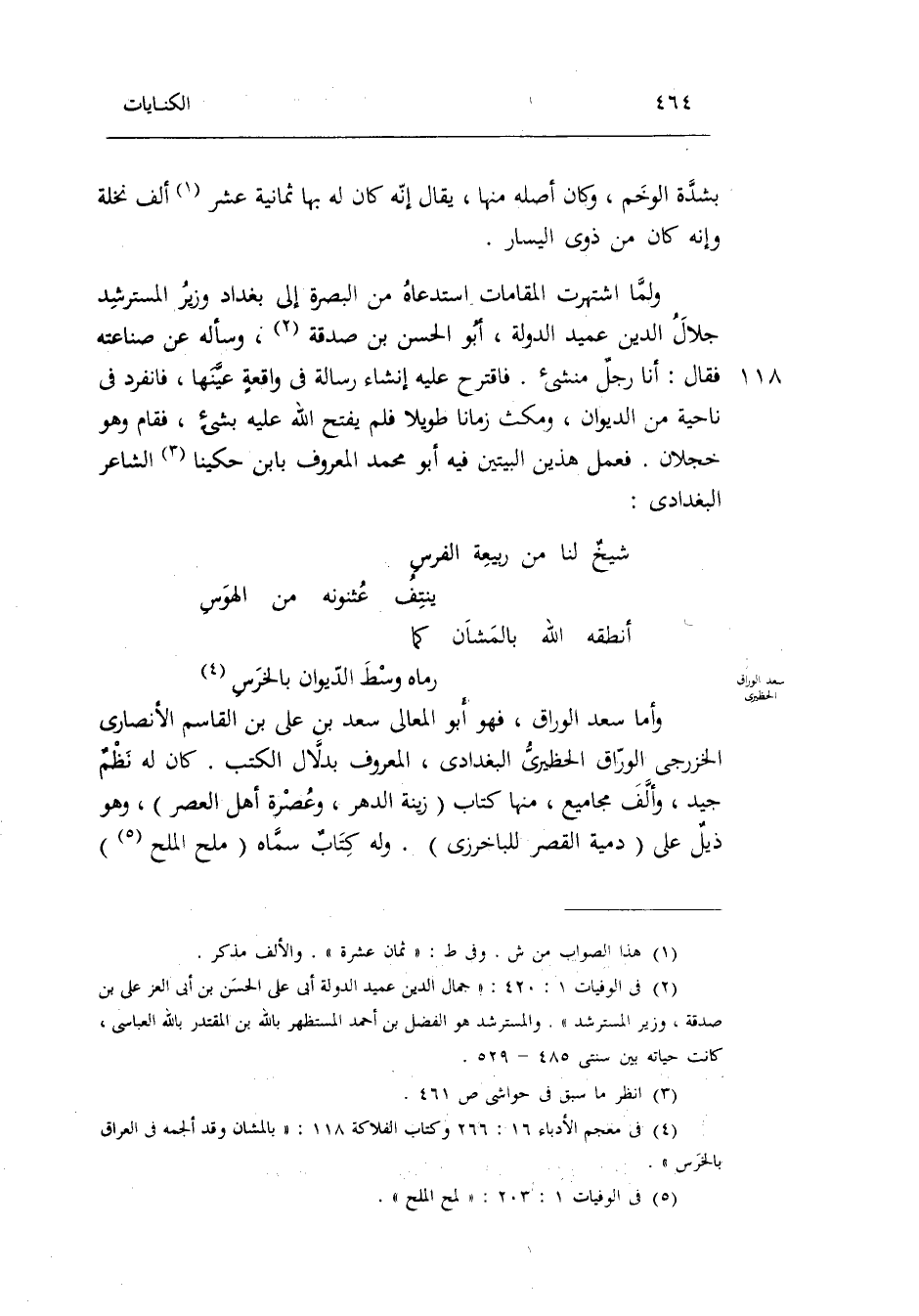 وَأما سعد الْوراق فَهُوَ أَبُو الْمَعَالِي سعد بن عَليّ بن الْقَاسِم الْأنْصَارِيّ الخزرجي الْوراق الحظيري الْبَغْدَادِيّ الْمَعْرُوف بدلال الْكتب. كَانَ لَهُ نظمٌ جيد وَألف مجاميع مِنْهَا كتاب زِينَة الدَّهْر وعصرة أهل الْعَصْر وَهُوَ ذيلٌ على دمية الْقصر للباخرزي.
