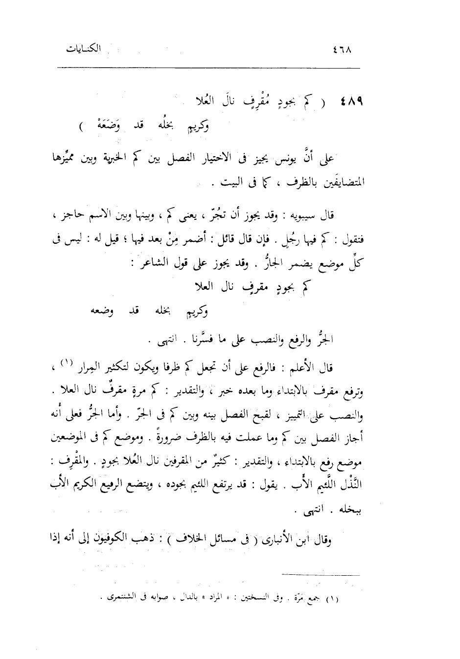 وَأما الْجَرّ فعلى أَنه أجَاز الْفَصْل بَين كم وَمَا عملت فِيهِ بالظرف ضَرُورَة. وَمَوْضِع كم فِي الْمَوْضِعَيْنِ مَوضِع رفع بِالِابْتِدَاءِ وَالتَّقْدِير: كثيرٌ من المقرفين نَالَ الْعلَا بجودٍ. والمقرف: النذل اللَّئِيم الْأَب. يَقُول: قد يرْتَفع اللَّئِيم بجوده ويتضع الرفيع الْكَرِيم الْأَب ببخله. انْتهى. وَقَالَ ابْن الْأَنْبَارِي فِي مسَائِل الْخلاف: ذهب الْكُوفِيُّونَ إِلَى أَنه إِذا