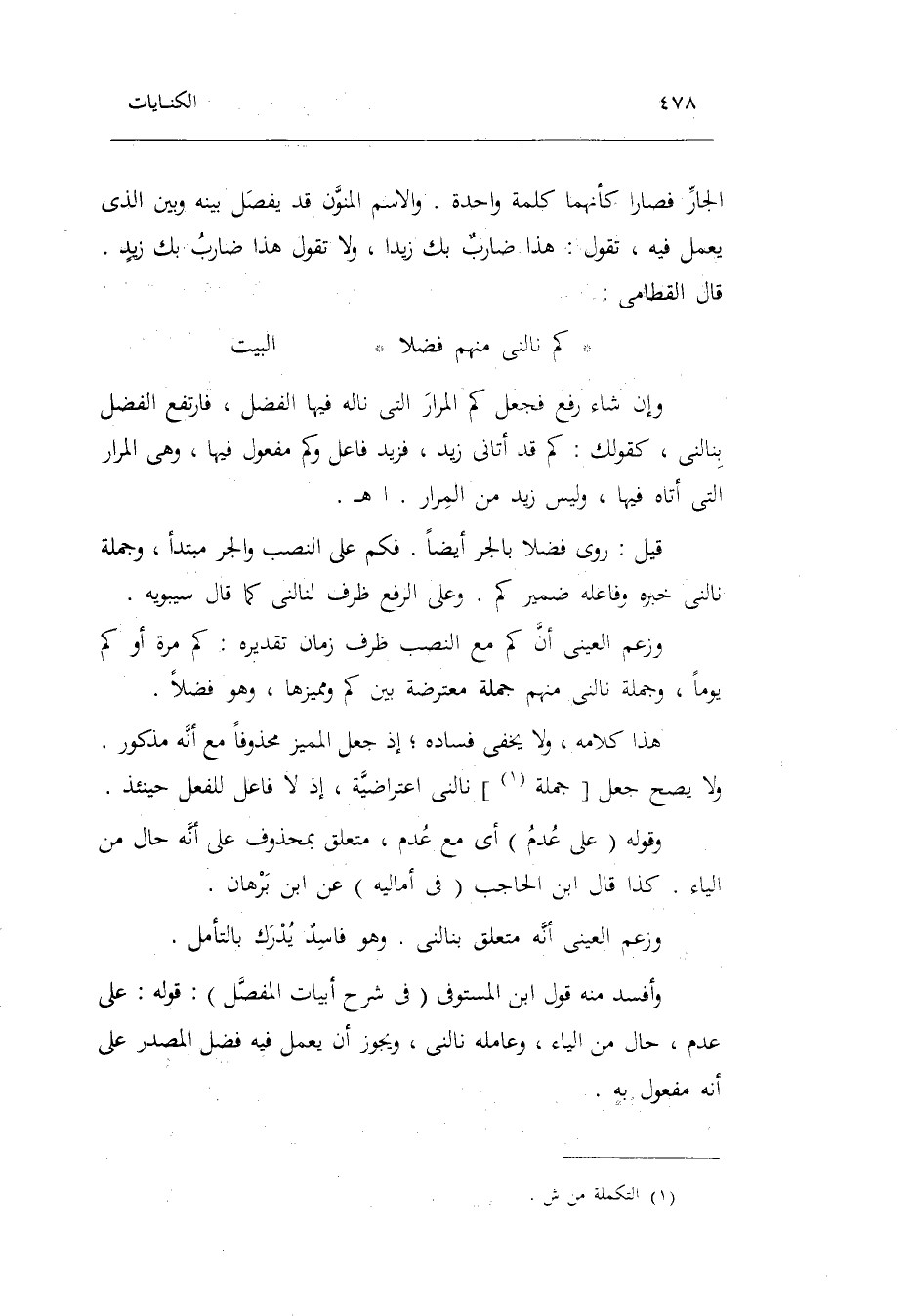 وَالِاسْم الْمنون قد يفصل بَينه وَبَين الَّذِي يعْمل فِيهِ تَقول: هَذَا ضاربٌ بك زيدا وَلَا تَقول هَذَا ضاربٌ بك زيدٍ. قَالَ الْقطَامِي: وَإِن شَاءَ رفع فَجعل كم المرار الَّتِي ناله فِيهَا الْفضل فارتفع الْفضل بنالني كَقَوْلِك: كم قد أَتَانِي زيد فزيد: فَاعل وَكم: مفعول فِيهَا وَهِي المرار الَّتِي أَتَاهُ فِيهَا وَلَيْسَ زيد من المرار. اه.