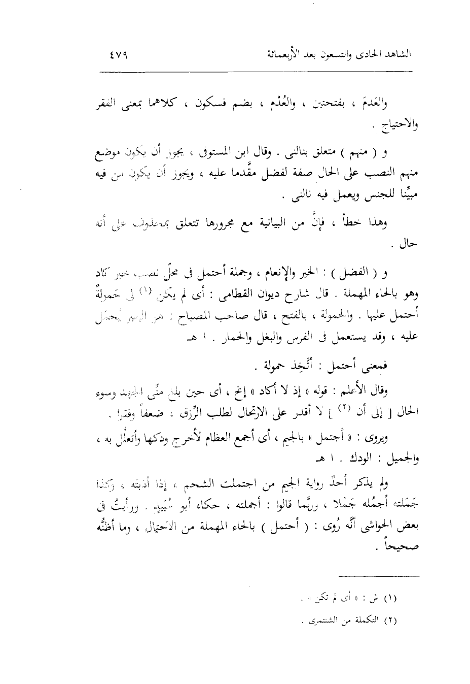 وَقَالَ ابْن المستوفي يجوز أَن يكون مَوضِع مِنْهُم النصب على الْحَال صفة لفضل مقدما عَلَيْهِ وَيجوز أَن يكون من قيه مَبْنِيا للْجِنْس وَيعْمل فِيهِ نالني. وَهَذَا خطأ فَإِن من البيانية مَعَ مجرورها تتَعَلَّق بِمَحْذُوف على أَنه حَال. وَالْفضل: الْخَيْر والإنعام وَجُمْلَة أحتمل فِي مَحل نصب خبر كَاد وَهُوَ بِالْحَاء الْمُهْملَة. قَالَ شَارِح ديوَان الْقطَامِي: أَي: لم يكن لي حمولةٌ أحتمل عَلَيْهَا. والحمولة بِالْفَتْح قَالَ صَاحب الْمِصْبَاح: هُوَ الْبَعِير يحمل عَلَيْهِ وَقد يسْتَعْمل فِي الْفرس والبغل وَالْحمار.)