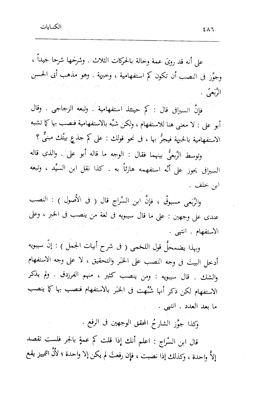 على أَنه قد رُوِيَ عمَّة وَخَالَة بالحركات الثَّلَاث. وَشَرحهَا شرحاً جيدا وَجوز فِي النصب أَن تكون كم استفهامية وخبرية. وَهُوَ مَذْهَب أبي الْحسن الربعِي. فَإِن السيرافي قَالَ: كم حِينَئِذٍ استفهامية. وَتَبعهُ الزجاجي. وَقَالَ أَبُو عَليّ: لَا معنى هُنَا للاستفهام وَلَكِن شبه بالاستفهامية فنصب بهَا كَمَا تشبه الاستفهامية بالخبرية فيجر بهَا فِي نَحْو قَوْلك: على كم جذعٍ بَيْتك مبنيٌّ.