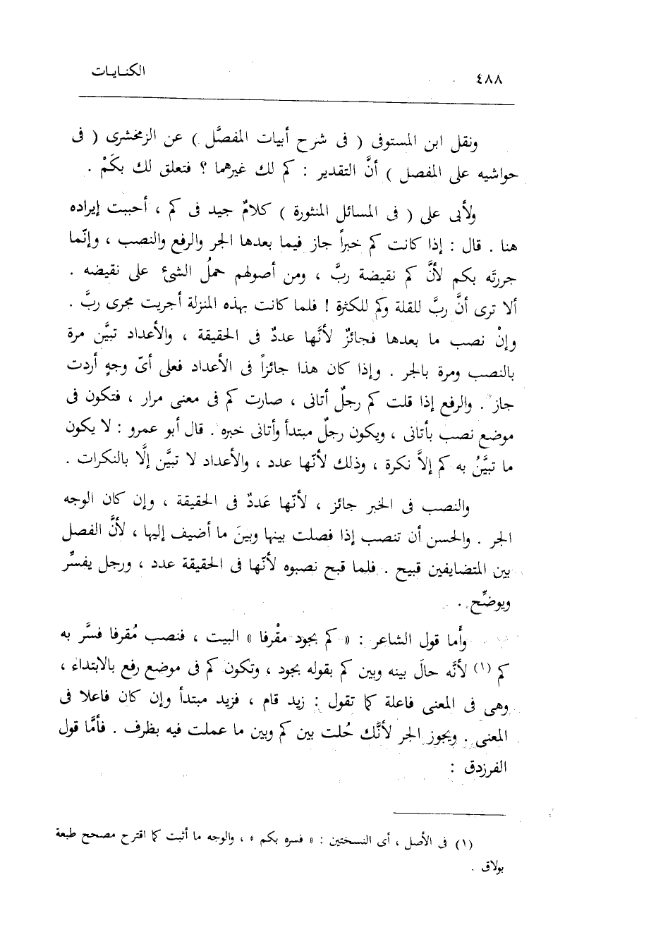 وَالْحسن أَن تنصب إِذا فصلت بَينهَا وَبَين مَا أضيف إِلَيْهَا لِأَن الْفَصْل بَين المتضايفين قَبِيح. فَلَمَّا قبح نصبوه لِأَنَّهَا فِي الْحَقِيقَة عدد وَرجل يُفَسر ويوضح. وَأما قَول الشَّاعِر: كم بجود مقرفاً الْبَيْت فنصب مقرفاً فسر بِهِ كم لِأَنَّهُ حَال بَينه وَبَين كم بقوله بجود وَتَكون كم فِي مَوضِع رفع بِالِابْتِدَاءِ وَهِي فِي الْمَعْنى فاعلة كَمَا تَقول: زيد قَامَ فزيد مُبْتَدأ وَإِن كَانَ فَاعِلا فِي الْمَعْنى.