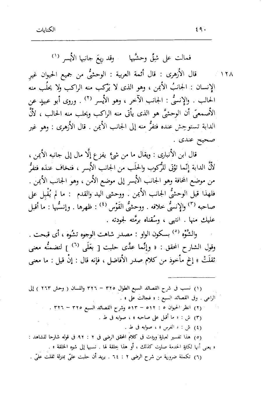 الحالب لِأَن الدَّابَّة تستوحش عِنْده فتفر مِنْهُ إِلَى الْجَانِب الْيمن. قَالَ الْأَزْهَرِي: وَهُوَ غير صَحِيح عِنْدِي. قَالَ ابْن الْأَنْبَارِي: وَيُقَال: مَا من شَيْء يفزع إِلَّا مَال إِلَى جَانِبه الْأَيْمن لِأَن الدَّابَّة إِنَّمَا تُؤْتى للرُّكُوب والحلب من الْجَانِب الْأَيْسَر فتخاف عِنْده فتفر من مَوضِع المخافة وَهُوَ الْجَانِب الْأَيْسَر إِلَى مَوضِع الْأَمْن وَهُوَ الْجَانِب الْأَيْمن. فَلهَذَا قيل الوحشي الْجَانِب الْأَيْمن. وَوَحْشِي الْيَد والقدم: مَا لم يقبل على صَاحبه والإنسي خِلَافه. وَوَحْشِي الْقوس: ظهرهَا. وإنسيها: مَا أقبل عَلَيْك مِنْهَا. انْتهى وسقناه برمتِهِ لجودته. والشوه بِسُكُون الْوَاو: مصدر شَاهَت الْوُجُوه تشوه أَي: قبحت. وَقَول الشَّارِح الْمُحَقق: وَإِنَّمَا عدى حلبت بعلى لتَضَمّنه معنى ثقلت إِلَخ مَأْخُوذ من كَلَام صدر الأفاضل فَإِنَّهُ قَالَ: إِن قيل: مَا معنى