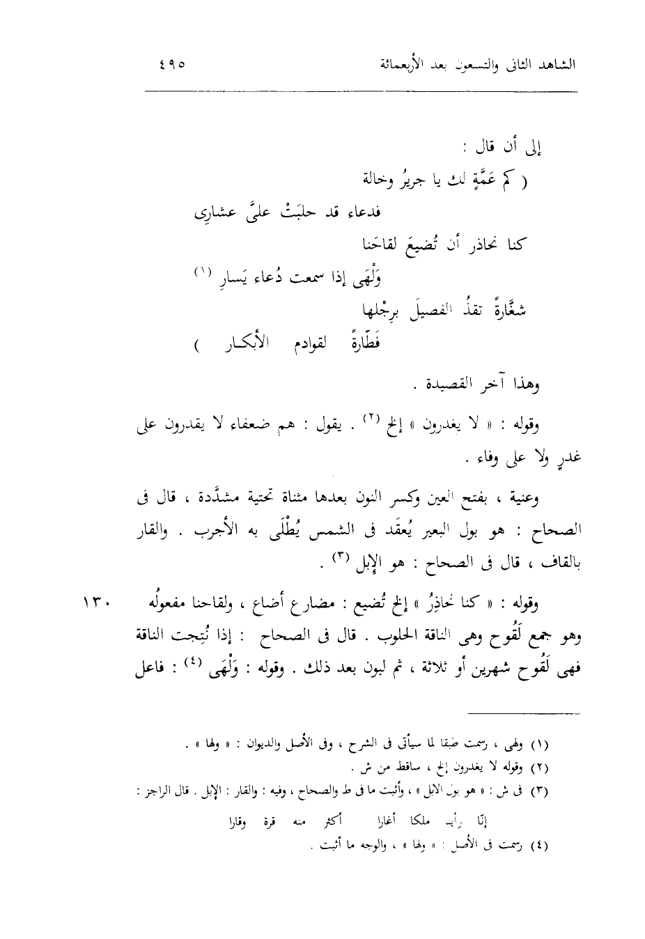 وعنية بِفَتْح الْعين وَكسر النُّون بعْدهَا مثناة تحتية مُشَدّدَة قَالَ فِي الصِّحَاح: هُوَ بَوْل الْبَعِير يعْقد فِي الشَّمْس يطلى بِهِ الأجرب. والقار بِالْقَافِ قَالَ فِي الصِّحَاح: هُوَ الْإِبِل. وَقَوله: كُنَّا نحاذر إِلَخ تضيع: مضارع أضاع ولقاحنا مَفْعُوله وَهُوَ جمع لقوح وَهِي النَّاقة الحلوب. قَالَ فِي الصِّحَاح: إِذا نتجت النَّاقة فَهِيَ لقوح شَهْرَيْن أَو ثَلَاثَة ثمَّ لبون بعد ذَلِك. وَقَوله: ولهى: فَاعل