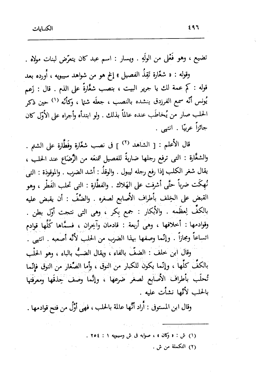 انْتهى. قَالَ الأعلم: الشَّاهِد فِي نصب شغارة وفطارة على الشتم. والشغارة: الَّتِي ترفع رجلهَا ضاربةً للفصيل لتمنعه من الرَّضَاع عِنْد الْحَلب يُقَال: شغر الْكَلْب إِذا رفع رجلَيْهِ ليبول.