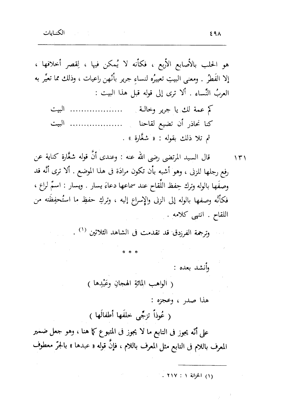 كُنَّا نحاذر أَن تضيع لقاحنا ... ... ... ... . . الْبَيْت ثمَّ تَلا ذَلِك بقوله: شغارة. قَالَ السَّيِّد المرتضى رَضِيَ اللَّهُ عَنْه: وَعِنْدِي أَن قَوْله شغارة كِنَايَة عَن رفع رجلهَا للزنى وَهُوَ أشبه بِأَن تكون مُرَادة فِي هَذَا الْموضع. أَلا ترى أَنه قد وصفهَا بالوله وَترك حفظ اللقَاح عِنْد سماعهَا دُعَاء يسَار. ويسار: اسمٌ لراع فَكَأَنَّهُ وصفهَا بالوله إِلَى الزِّنَى والإسراع إِلَيْهِ وَترك حفظ مَا استحفظته من اللقَاح. انْتهى كَلَامه. وترجمة الفرزدق قد تقدّمت فِي الشَّاهِد الثَّلَاثِينَ. وَأنْشد بعده: