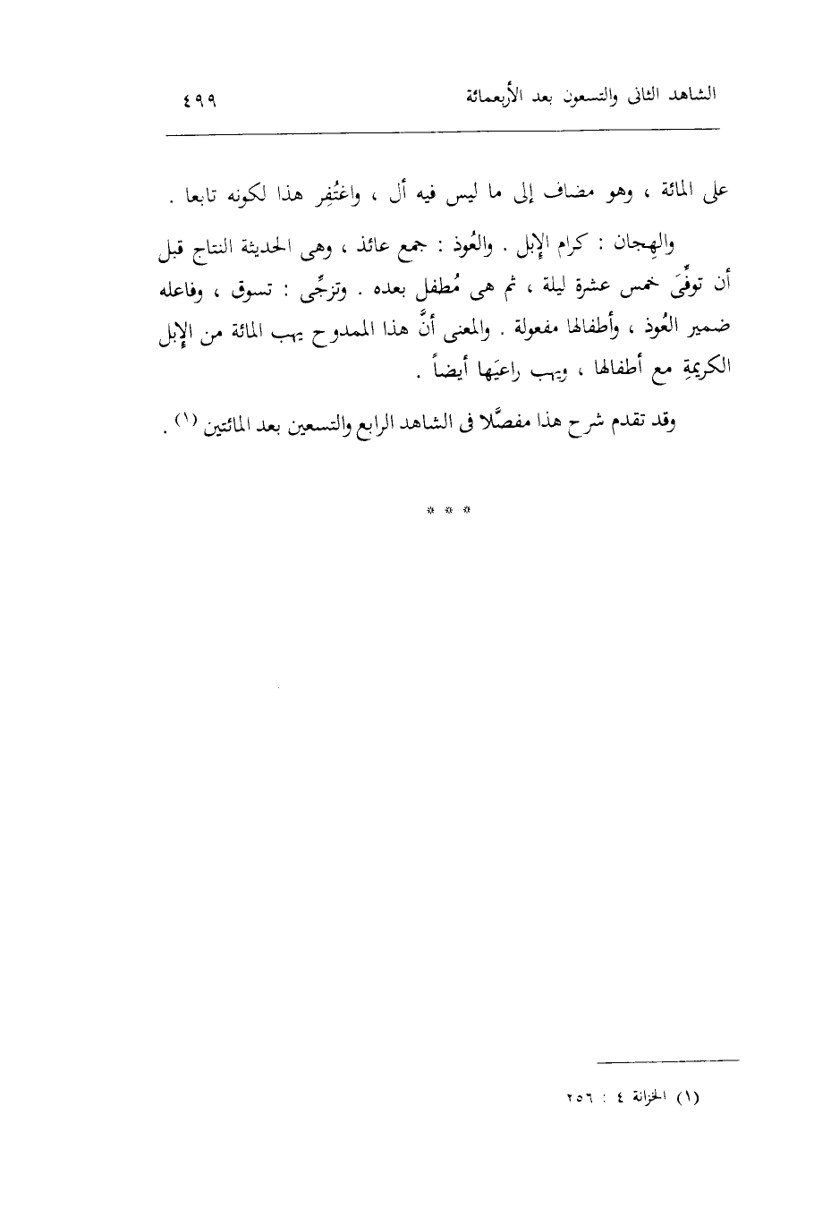 على الْمِائَة وَهُوَ مُضَاف إِلَى مَا لَيْسَ فِيهِ أل واغتفر هَذَا لكَونه تَابعا. والهجان: كرام الْإِبِل. والعوذ: جمع عَائِذ وَهِي الحديثة النِّتَاج قبل أَن توفّي خمس عشرَة لَيْلَة ثمَّ هِيَ مطفل بعده. وتزجي: تَسوق وفاعله ضمير العوذ وأطفالها مفعولة. وَالْمعْنَى أَن هَذَا الممدوح يهب الْمِائَة من الْإِبِل الْكَرِيمَة مَعَ أطفالها ويهب راعيها أَيْضا.