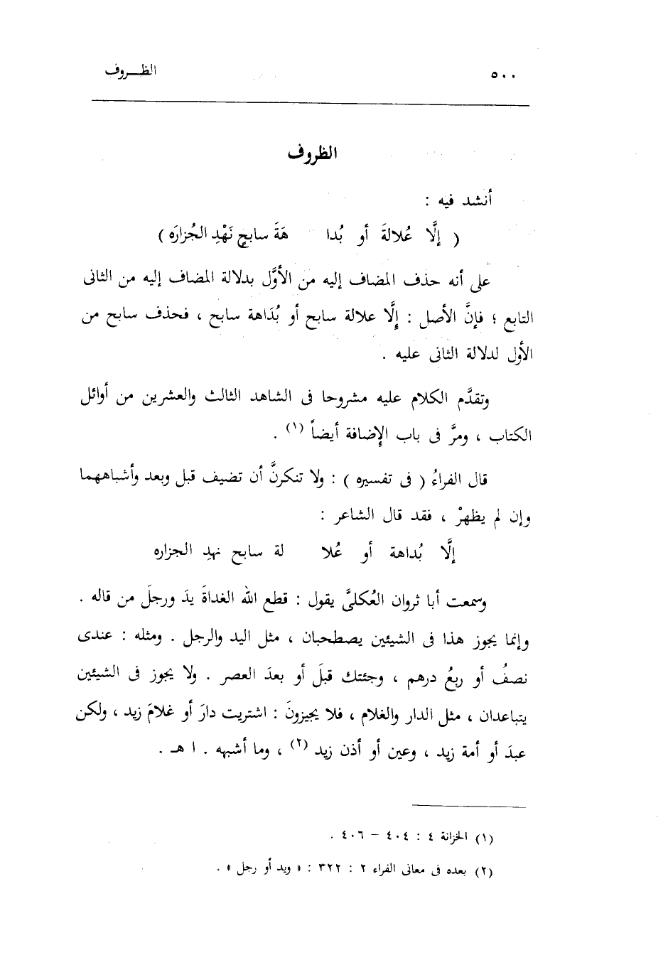 على أَنه حذف الْمُضَاف إِلَيْهِ من الأول بِدلَالَة الْمُضَاف إِلَيْهِ من الثَّانِي التَّابِع فَإِن الأَصْل: إِلَّا علالة سابح أَو بداهة سابح فَحذف سابح من الأول لدلَالَة الثَّانِي عَلَيْهِ. وَتقدم الْكَلَام عَلَيْهِ مشروحاً فِي الشَّاهِد الثَّالِث وَالْعِشْرين من أَوَائِل الْكتاب وَمر فِي بَاب الْإِضَافَة أَيْضا. قَالَ الْفراء فِي تَفْسِيره: وَلَا تنكرن أَن تضيف قبل وَبعد وأشباههما وَإِن لم يظْهر فقد قَالَ الشَّاعِر: