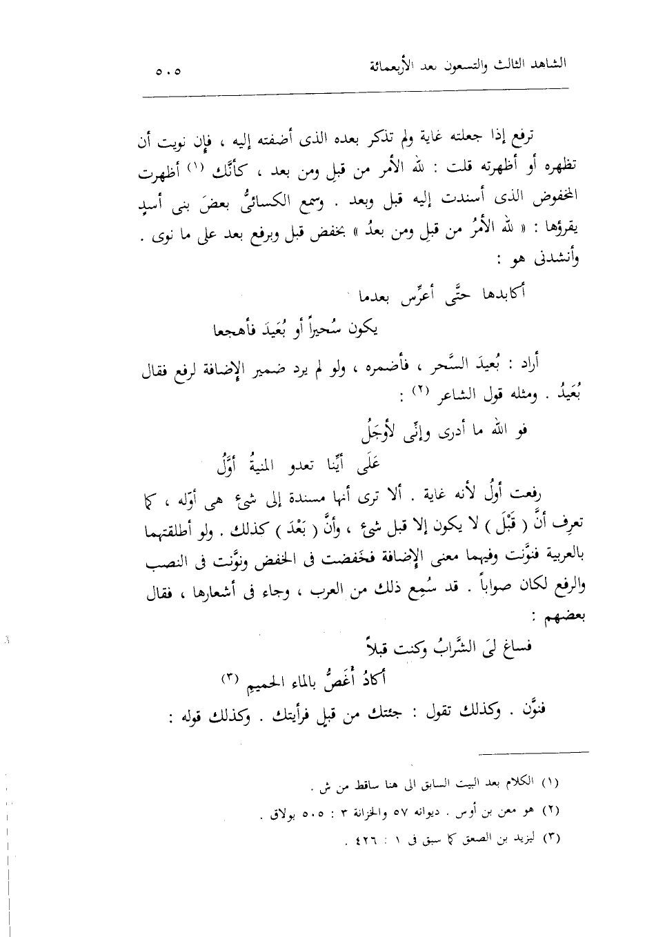 أَرَادَ: بعيد السحر فأضمره وَلَو لم يرد ضمير الْإِضَافَة لرفع فَقَالَ: بعيد. وَمثله قَول الشَّاعِر الطَّوِيل:
