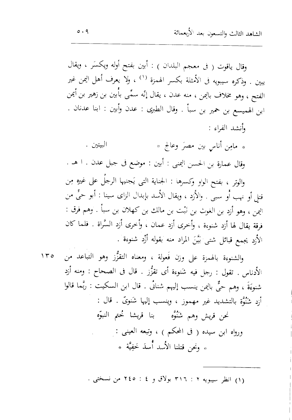 وَقَالَ عمَارَة بن الْحسن اليمني: أبين: مَوضِع فِي جبل عدن. اه. وَالْوتر بِفَتْح الْوَاو وَكسرهَا: الْجِنَايَة الَّتِي يجنيها الرجل على غَيره من قتلٍ أَو نهب أَو سبي. والأزد وَيُقَال: الْأسد بإبدال الزَّاي سيناً: أَبُو حيٍّ من الْيمن وَهُوَ أَزْد بن الْغَوْث بن نبت بن مَالك بن كهلان بن سبأ. وَهُوَ فرق: فرقة يُقَال لَهَا: أَزْد شنُوءَة وَأُخْرَى أَزْد عمان وَأُخْرَى أَزْد السراة. فَلَمَّا كَانَ الأزد يجمع قبائل شَتَّى بَين المُرَاد مِنْهُ بقوله أَزْد شنُوءَة. والشنوءة بِالْهَمْزَةِ على وزن فعولة وَمَعْنَاهُ التقزز وَهُوَ التباعد من الأدناس. تَقول: رجل فِيهِ شنُوءَة أَي: تقزز. قَالَ فِي الصِّحَاح: وَمِنْه أَزْد شنُوءَة وهم حيٌّ بِالْيمن ينْسب إِلَيْهِم شنائي. قَالَ ابْن السّكيت رُبمَا قَالُوا أَزْد شنوة بِالتَّشْدِيدِ غير مَهْمُوز وينسب إِلَيْهَا شنوي. قَالَ الرجز:
