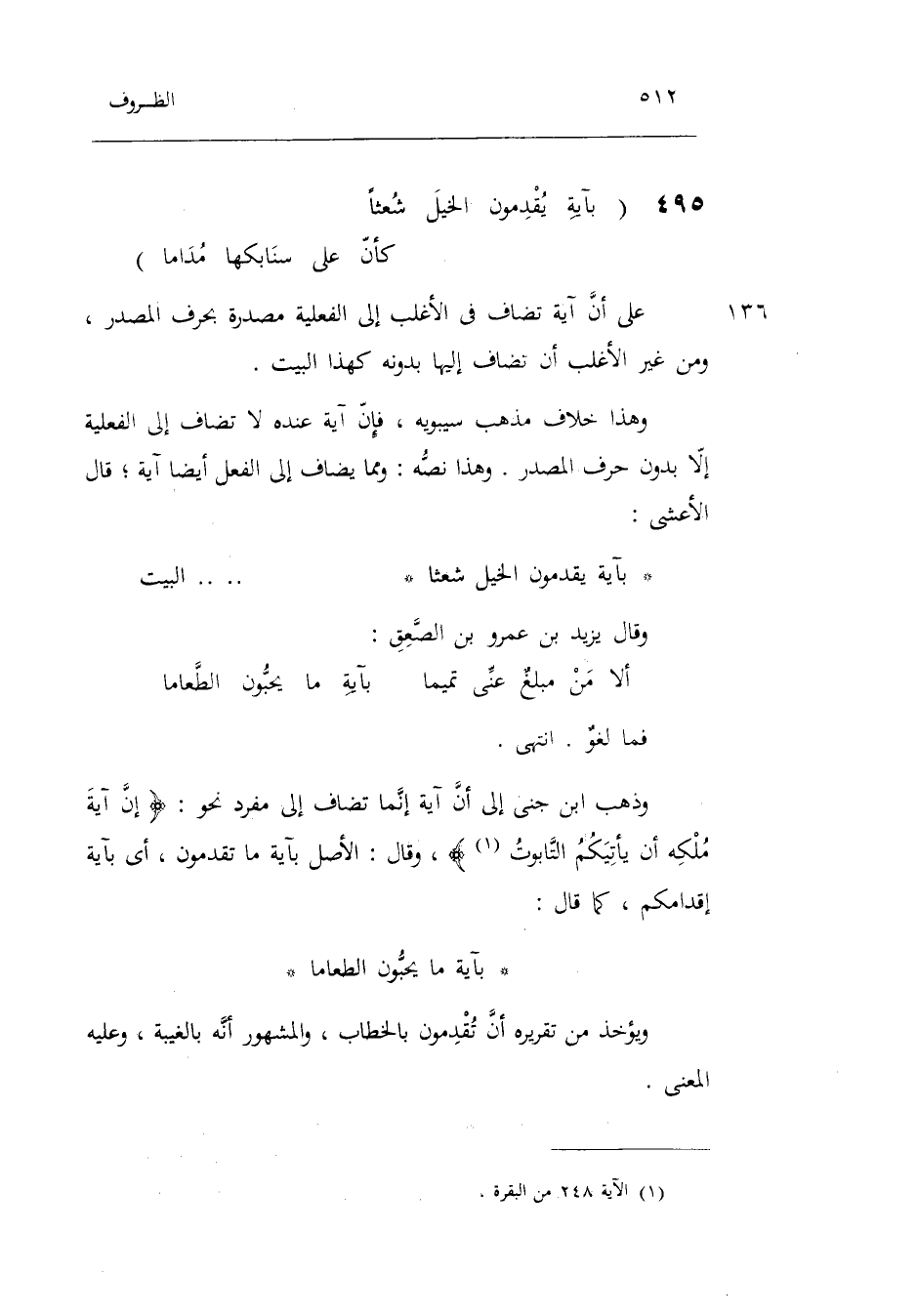 على أَن آيَة تُضَاف فِي الْأَغْلَب إِلَى الفعلية مصدرة بِحرف الْمصدر وَمن غير الْأَغْلَب أَن تُضَاف إِلَيْهَا بِدُونِهِ كَهَذا الْبَيْت. وَهَذَا خلاف مَذْهَب سِيبَوَيْهٍ فَإِن آيَة عِنْده لَا تُضَاف إِلَى الفعلية إِلَّا بِدُونِ حرف الْمصدر. هَذَا نَصه: وَمِمَّا يُضَاف إِلَى الْفِعْل أَيْضا قَالَ الْأَعْشَى: بِآيَة يقدمُونَ الْخَيل شعثاً ... ... ... ... . . الْبَيْت وَقَالَ يزِيد بن عَمْرو بن الصَّعق: فَمَا: لغوٌ. انْتهى. وَذهب ابْن جني إِلَى أَن آيَة إِنَّمَا تُضَاف إِلَى مُفْرد نَحْو: إِن آيَة ملكه أَن