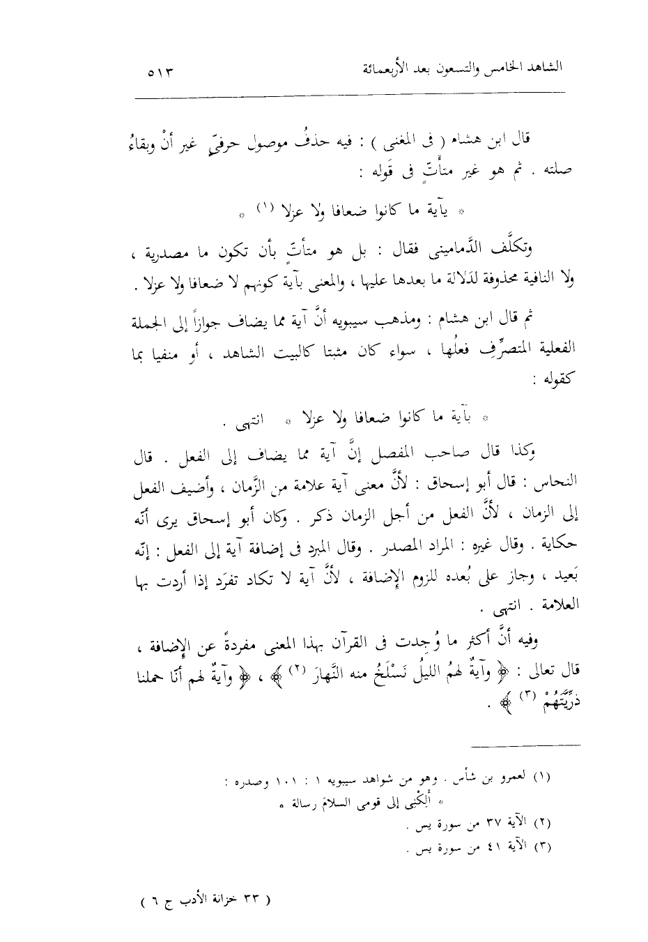 قَالَ ابْن هِشَام فِي الْمُغنِي: فِيهِ حذف مَوْصُول حرفيٍّ غير أَن وَبَقَاء صلته. ثمَّ هُوَ غير متأتٍّ فِي قَوْله الطَّوِيل: بِآيَة مَا كَانُوا ضعافاً وَلَا عزلاً وتكلف الدماميني فَقَالَ: بل هُوَ متأتٍّ بِأم تكون مَا مَصْدَرِيَّة وَلَا النافية محذوفة لدلَالَة مَا بعْدهَا عَلَيْهَا وَالْمعْنَى بِآيَة كَونهم لَا ضعافاً وَلَا عزلاً. ثمَّ قَالَ ابْن هِشَام: وَمذهب سِيبَوَيْهٍ أَن آيَة مِمَّا يُضَاف جَوَازًا إِلَى الْجُمْلَة الفعلية الْمُتَصَرف فعلهَا سَوَاء كَانَ مثبتاً كالبيت الشَّاهِد أَو منفياً بِمَا كَقَوْلِه: بِآيَة مَا كَانُوا ضعافاً وَلَا عزلاً انْتهى.