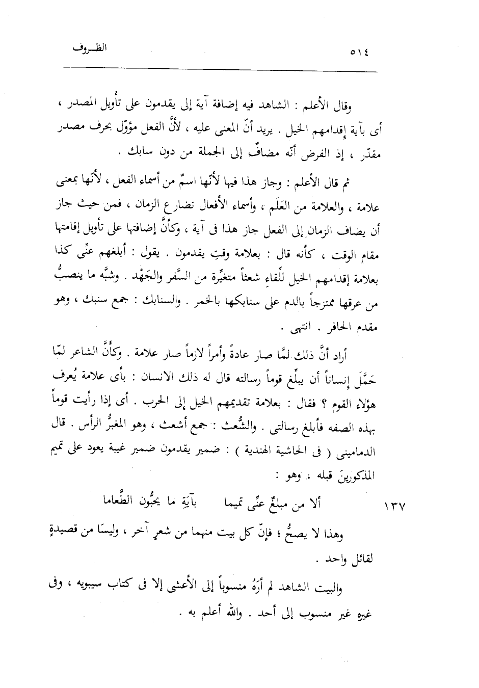 أَرَادَ أَن ذَلِك لما صَار عَادَة وأمراً لَازِما صَار عَلامَة. وَكَأن الشَّاعِر لما حمل إنْسَانا أَن يبلغ قوما رسَالَته قَالَ لَهُ ذَلِك الْإِنْسَان: بِأَيّ عَلامَة يعرف هَؤُلَاءِ الْقَوْم فَقَالَ: بعلامة تقديمهم الْخَيل إِلَى الْحَرْب. أَي: إِذا رَأَيْت قوما بِهَذِهِ الصّفة فأبلغ رسالتي. والشعث: جمع أَشْعَث وَهُوَ المغبر الرَّأْس. قَالَ الدماميني فِي الْحَاشِيَة الْهِنْدِيَّة: ضمير يقدمُونَ ضمير غيبَة يعود على تَمِيم الْمَذْكُورين قبله وَهُوَ: وَهَذَا لَا يَصح فَإِن كل بَيت مِنْهُمَا من شعرٍ آخر وليسا من قصيدةٍ لقَائِل وَاحِد. وَالْبَيْت الشَّاهِد لم أره مَنْسُوبا إِلَى الْأَعْشَى فِي كتاب سِيبَوَيْهٍ وَفِي غَيره غير مَنْسُوب إِلَى أحد. وَالله أعلم بِهِ.