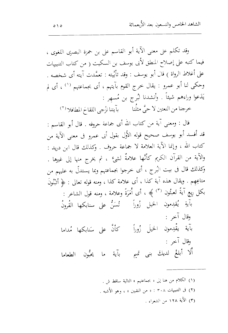 وَقد تكلم على معنى الْآيَة أَبُو الْقَاسِم عَليّ بن حَمْزَة الْبَصْرِيّ اللّغَوِيّ فِيمَا كتبه على إصْلَاح الْمنطق لأبي يُوسُف بن السّكيت من كتاب التَّنْبِيهَات على أغلاط الروَاة قَالَ أَبُو يُوسُف: وَقد تأييته: تَعَمّدت آيَته أَي: شخصه. وَحكى لنا أَبُو عَمْرو: يُقَال خرج الْقَوْم بآيتهم أَي: بجماعتهم أَي: لم يدعوا وَرَاءَهُمْ شَيْئا. وأنشدنا لبرج بن مسهرالطويل: