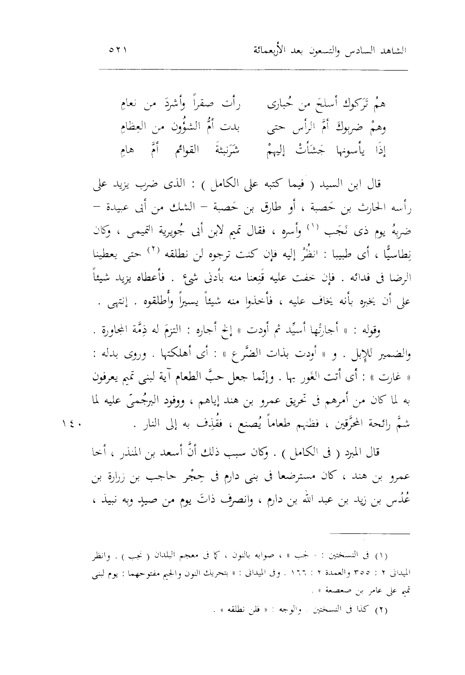 قَالَ ابْن السَّيِّد فِيمَا كتبه على الْكَامِل: الَّذِي ضرب يزِيد على رَأسه الْحَارِث بن حصبة أَو طَارق بن حصبة الشَّك من أبي عُبَيْدَة ضربه يَوْم ذِي نجب وأسره فَقَالَ تَمِيم لِابْنِ أبي جوَيْرِية التَّمِيمِي وَكَانَ نطاسياً أَي: طَبِيبا: انْظُر إِلَيْهِ فَإِن كنت ترجوه فَلَنْ نطلقه حَتَّى يُعْطِينَا الرِّضَا فِي فدائه. فَإِن خفت عَلَيْهِ قنعنا مِنْهُ بِأَدْنَى شَيْء. فَأعْطَاهُ يزِيد شَيْئا على أَن يُخبرهُ بِأَنَّهُ يخَاف عَلَيْهِ فَأخذُوا مِنْهُ شَيْئا يَسِيرا وأطلقوه. انْتهى. وَقَوله: أجارتها أسيد ثمَّ أوردت إِلَخ أجاره: الْتزم لَهُ ذمَّة الْمُجَاورَة. وَالضَّمِير لِلْإِبِلِ. وأودت بِذَات الضَّرع أَي: أهلكتها. وروى بدله: غارت أَي: أَتَت الْغَوْر بهَا.