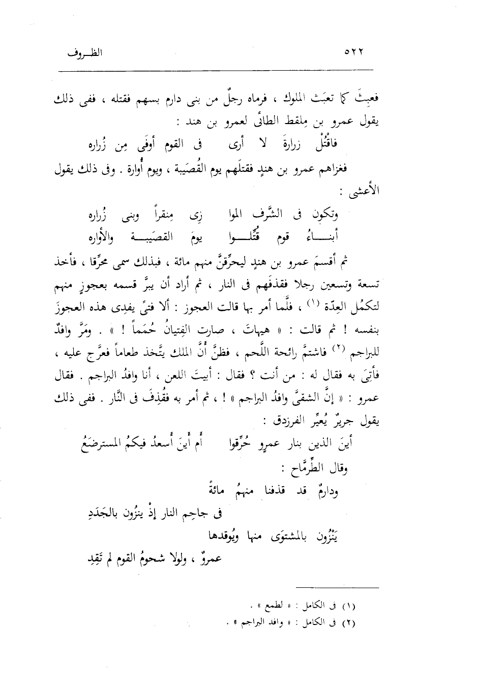 البراجم. فَقَالَ عَمْرو: إِن الشقي وَافد البراجم ثمَّ أَمر بِهِ فقذف فِي النَّار. فَفِي ذَلِك يَقُول جريرٌ يعير الفرزدق الْكَامِل: