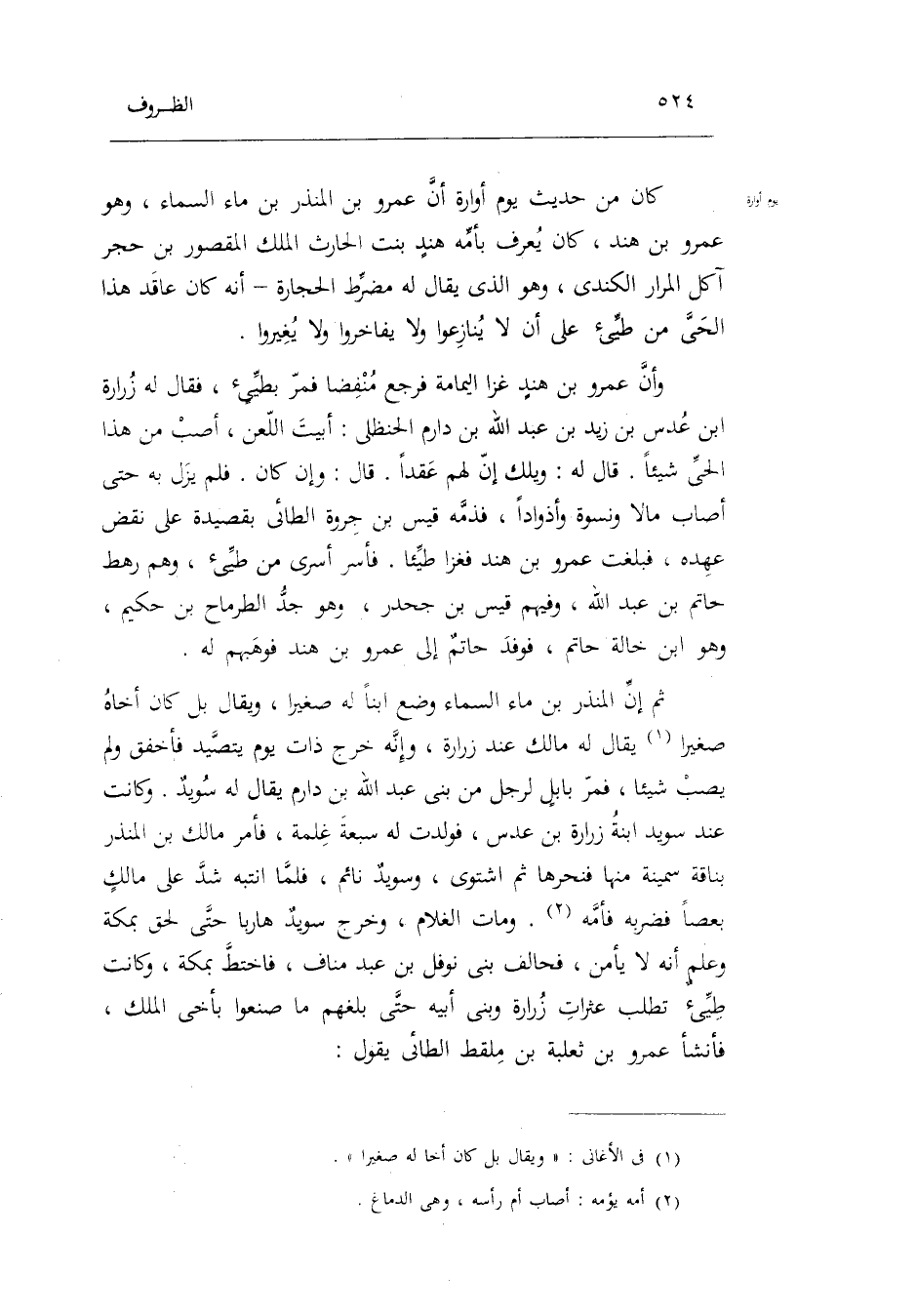 قَالَ: وَإِن كَانَ. فَلم يزل بِهِ حَتَّى أصَاب مَالا ونسوة وأذواداً فذمه قيس بن جروة الطَّائِي بقصيدة على نقض عَهده فبلغت عَمْرو بن هِنْد فغزا طيئاً. فَأسر أسرى من طَيئ من بني عدي بن أخزم وهم رَهْط حَاتِم بن عبد الله وَفِيهِمْ قيس بن جحدر وَهُوَ جد الطرماح بن حَكِيم وَهُوَ ابْن خَالَة حَاتِم فوفد حاتمٌ فيهم إِلَى عَمْرو بن هِنْد فوهبهم لَهُ. ثمَّ إِن الْمُنْذر بن مَاء السَّمَاء وضع ابْنا لَهُ صَغِيرا وَيُقَال: بل كَانَ أَخَاهُ صَغِيرا يُقَال لَهُ: مَالك عِنْد زُرَارَة وَإنَّهُ خرج ذَات يَوْم يتصيد فأخفق وَلم يصب شَيْئا فَمر بإبلٍ لرجل من بني عبد الله بن دارم يُقَال لَهُ: سويدٌ.