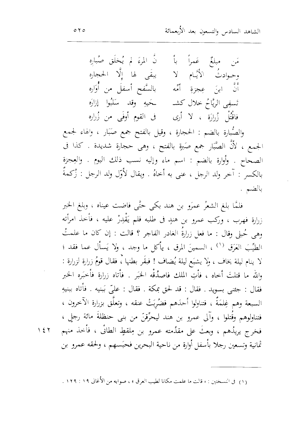آخر ولد الرجل عَنى بِهِ أَخَاهُ. وَيُقَال لأوّل ولد الرجل: زكمةٌ بِالضَّمِّ. فَلَمَّا بلغ الْعشْر عَمْرو بن هِنْد بَكَى حَتَّى فاضت عَيناهُ وَبلغ الْخَبَر زُرَارَة فهرب وَركب عَمْرو بن هندٍ فِي طلبه فَلم يقدر عَلَيْهِ فَأخذ امْرَأَته وَهِي حُبْلَى وَقَالَ: مَا فعل زُرَارَة الغادر الْفَاجِر قَالَت: إِن كَانَ مَا علمت لطيب الْعرق سمين المرق وَيَأْكُل مَا وجد وَلَا يسْأَل عَمَّا فقد وَلَا ينَام لَيْلَة يخَاف وَلَا يشْبع لَيْلَة يُضَاف فبقر بَطنهَا فَقَالَ قوم زُرَارَة لزرارة: وَالله مَا قتلت أَخَاهُ فأت الْملك فاصدقه الْخَبَر. فَأَتَاهُ زُرَارَة فَأخْبرهُ الْخَبَر فَقَالَ: جئني بِسُوَيْدِ. فَقَالَ: قد لحق بِمَكَّة. فَقَالَ: عَليّ ببنيه. فَأَتَاهُ ببنيه السَّبْعَة وبأمهم بنت زُرَارَة وهم غلمةٌ فتناولوا أحدهم فَضربت عُنُقه وَتعلق بزرارة الْآخرُونَ فتناولوهم وَقتلُوا. وآلى عَمْرو بن هِنْد ليحرقن من بني حَنْظَلَة مائَة رجلٍ فَخرج يريدهم وَبعث على مقدمته عَمْرو بن ملقطٍ الطَّائِي فَأخذ مِنْهُم ثَمَانِيَة وَتِسْعين رجلا بِأَسْفَل أوارة من نَاحيَة الْبَحْرين فحبسهم ولحقه عَمْرو بن