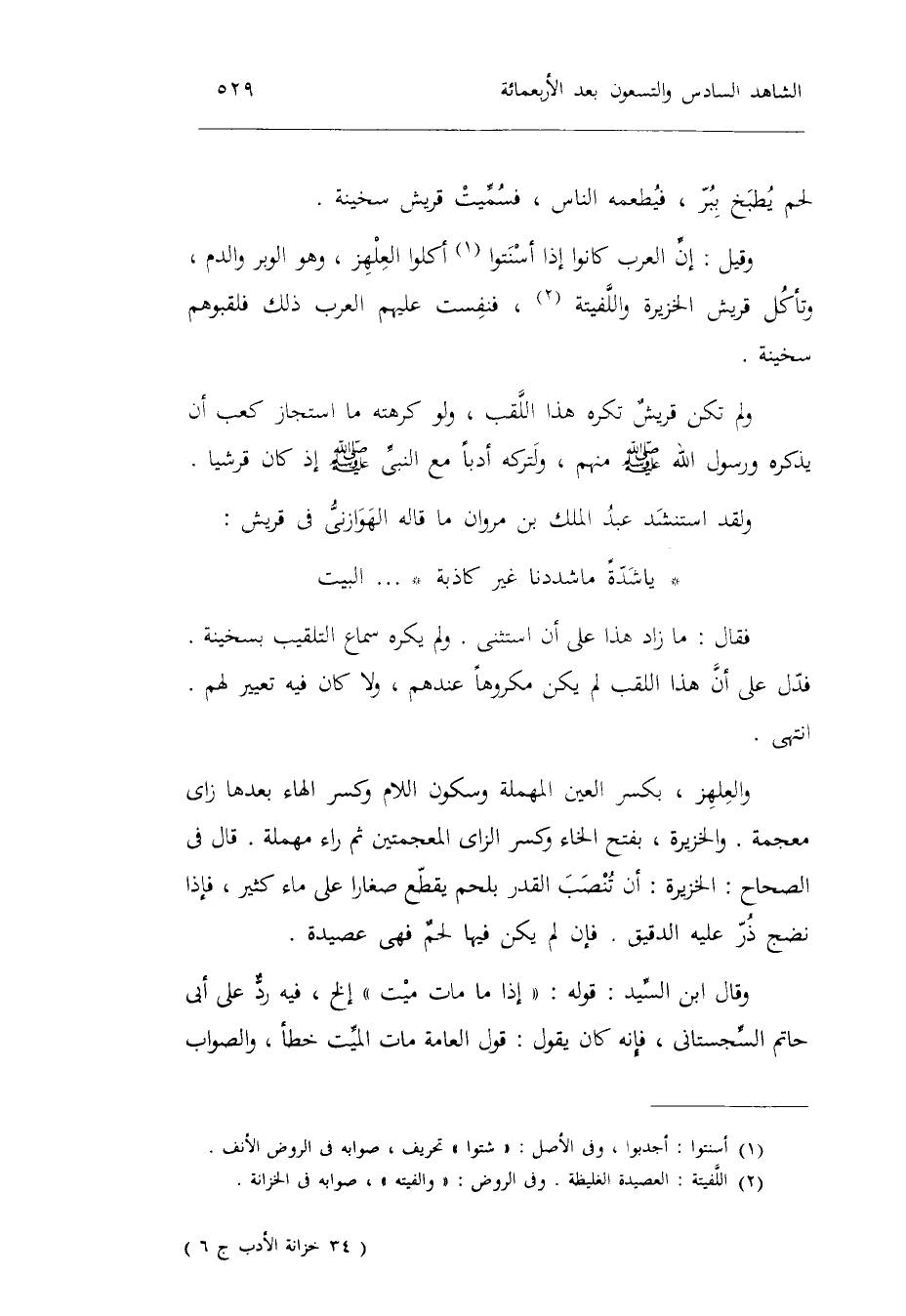 فَقَالَ: مَا زَاد هَذَا على أَن اسْتثْنى. وَلم يكره سَماع التلقيب بسخينة. فَدلَّ على أَن هَذَا اللقب لم يكن مَكْرُوها عِنْدهم وَلَا كَانَ فِيهِ تعيير لَهُم. انْتهى. وَالْعِلْهِز بِكَسْر الْعين الْمُهْملَة وَسُكُون اللَّام وَكسر الْهَاء بعْدهَا زَاي مُعْجمَة. والخزيرة بِفَتْح الْخَاء وَكسر الزَّاي المعجمتين ثمَّ رَاء مُهْملَة. قَالَ فِي