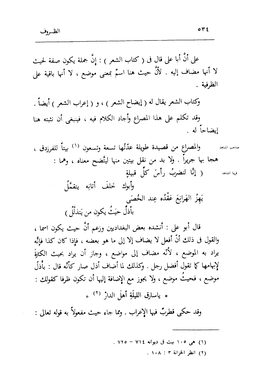 على أَن أَبَا عَليّ قَالَ فِي كتاب الشّعْر: إِن جملَة يكون صفة ل حَيْثُ لَا أَنَّهَا مُضَاف إِلَيْهِ. لِأَن حَيْثُ هُنَا اسْم بِمَعْنى مَوضِع لَا أَنَّهَا بَاقِيَة على الظَّرْفِيَّة. وَكتاب الشّعْر يُقَال لَهُ: إِيضَاح الشّعْر وإعراب الشّعْر أَيْضا. وَقد تكلم على هَذَا المصراع وأجاد الْكَلَام فِيهِ فَيَنْبَغِي أَن نثبته هُنَا إيضاحاً لَهُ. والمصراع من قصيدة طَوِيلَة عدتهَا تِسْعَة وَتسْعُونَ بَيْتا للفرزدق هجا بهَا جَرِيرًا.
