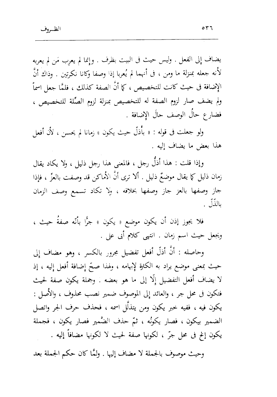 يُضَاف إِلَى الْفِعْل. وَلَيْسَ حَيْثُ فِي الْبَيْت بظرف. وَإِنَّمَا لم يعرب من لم يعربه لِأَنَّهُ جعله بِمَنْزِلَة مَا وَمن فِي أَنَّهُمَا لم يعربا إِذا وَصفا وَكَانَا نكرتين. وَذَاكَ أَن الْإِضَافَة فِي حَيْثُ كَانَت للتخصيص كَمَا أَن الصّفة كَذَلِك فَلَمَّا جعل اسْما وَلم يضف صَار لُزُوم الصّفة لَهُ للتخصيص بِمَنْزِلَة لُزُوم الصِّلَة للتخصيص فضارع حَال الْوَصْف حَال الْإِضَافَة. وَلَو جعلت فِي قَوْله: بأذل حَيْثُ يكون زَمَانا لم يحسن لِأَن أفعل هَذَا بعض مَا يُضَاف إِلَيْهِ. وَإِذا قلت: هَذَا أذلّ رجل فَالْمَعْنى: هَذَا رجل ذليل وَلَا يكَاد يُقَال: زمَان ذليل كَمَا يُقَال: مَوضِع ذليل. أَلا ترى أَن الْأَمَاكِن قد وصفت بالعز فَإِذا جَازَ وصفهَا بالعز جَازَ وصفهَا بِخِلَافِهِ وَلَا تكَاد تسمع وصف الزَّمَان بالذل. فَلَا يجوز إِذن أَن يكون مَوضِع يكون جراً بِأَنَّهُ صفة حَيْثُ وَيجْعَل حَيْثُ اسْم زمَان. انْتهى كَلَام أبي عَليّ. وَحَاصِله: أَن أذلّ أفعل تَفْضِيل مجرور بِالْكَسْرِ وَهُوَ مُضَاف إِلَى حَيْثُ بِمَعْنى مَوضِع يُرَاد بِهِ الْكَثْرَة لإبهامه وَلِهَذَا صَحَّ إِضَافَة أفعل إِلَيْهِ إِذْ لَا يُضَاف أفعل التَّفْضِيل إِلَّا إِلَى مَا هُوَ بعضه. وَجُمْلَة يكون: صفة ل حَيْثُ فَتكون فِي مَحل جر والعائد إِلَى الْمَوْصُوف ضمير نصب مَحْذُوف وَالْأَصْل: يكون فِيهِ فَفِيهِ خبر يكون وَمن يتذلل اسْمه فَحذف حرف الْجَرّ واتصل الضَّمِير بيكون فَصَارَ يكونه ثمَّ حذف الضَّمِير فَصَارَ