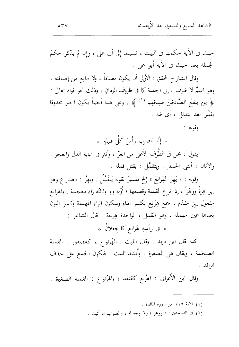 حَيْثُ فِي الْآيَة حكمهَا فِي الْبَيْت نسبهما إِلَى أبي عَليّ وَإِن لم يذكر حكم الْجُمْلَة بعد حَيْثُ فِي الْآيَة أَبُو عَليّ. وَقَالَ الشَّارِح الْمُحَقق: الأولى أَن يكون مُضَافا وَلَا مَانع من إِضَافَته وَهُوَ اسمٌ لَا ظرف إِلَى الْجُمْلَة كَمَا فِي ظروف الزَّمَان وَذَلِكَ نَحْو قَوْله تَعَالَى: يَوْم ينفع الصَّادِقين صدقهم. وعَلى هَذَا أَيْضا يكون الْخَبَر محذوفاً يقدر بعد يتذلل أَي: فِيهِ.