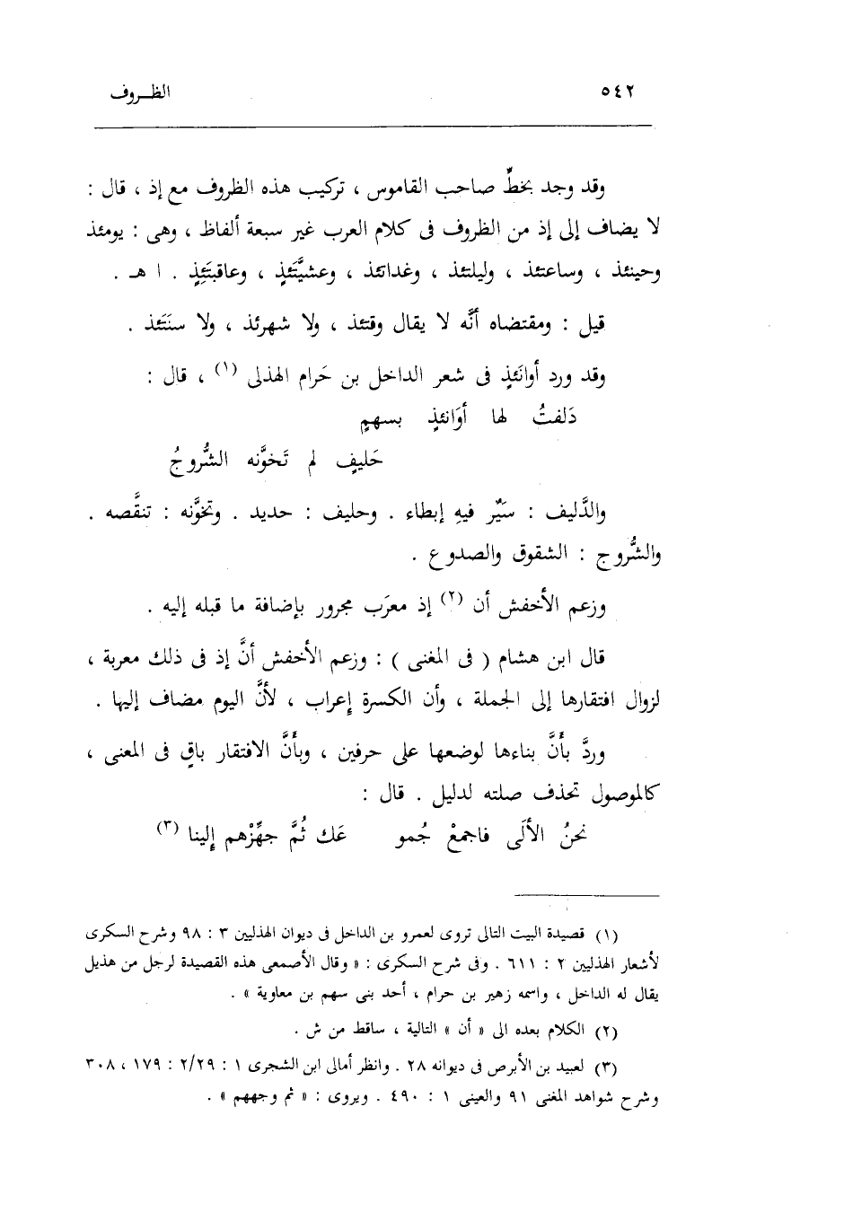 وَزعم الْأَخْفَش أَن إِذْ مُعرب مجرور بِإِضَافَة مَا قبله إِلَيْهِ. قَالَ ابْن هِشَام فِي الْمُغنِي: وَزعم الْأَخْفَش أَن إِذْ فِي ذَلِك معربة لزوَال افتقارها إِلَى الْجُمْلَة وَأَن الكسرة إِعْرَاب لِأَن الْيَوْم مُضَاف إِلَيْهَا. ورد بِأَن بناءها لوضعها على حرفين وَبِأَن الافتقار بَاقٍ فِي الْمَعْنى كالموصول تحذف صلته لدَلِيل. قَالَ مجزوء الْكَامِل:
