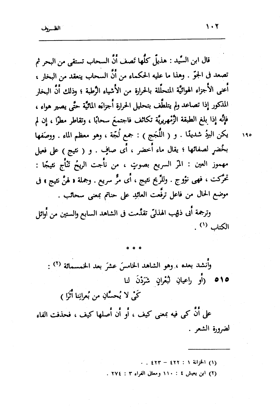قَالَ ابْن السَّيِّد: هذيلٌ كلهَا تصف أَن السَّحَاب تستقي من الْبَحْر ثمَّ تصعد فِي الجو. وَهَذَا مَا عَلَيْهِ الْحُكَمَاء من أَن السَّحَاب ينْعَقد من البخار أَعنِي الْأَجْزَاء الهوائية المائية المتحللة بالحرارة من الْأَشْيَاء الرّطبَة وَذَلِكَ أَن البخار الْمَذْكُور إِذا تصاعد وَلم يتلطف بتحليل الْحَرَارَة أجزاءه المائية حَتَّى يصير هَوَاء فَإِنَّهُ إِذا بلغ الطَّبَقَة الزمهريرية تكاثف فَاجْتمع سحاباً وتقاطر مَطَرا إِن لم يكن الْبرد شَدِيدا.