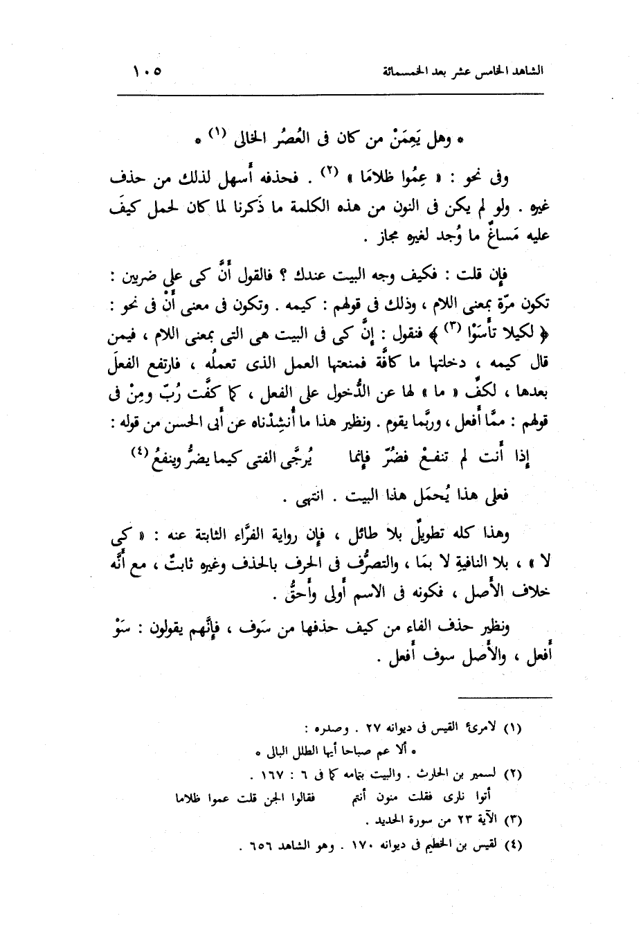 الطَّوِيل وَهل يعمن من كَانَ فِي الْعَصْر الْخَالِي وَفِي نَحْو: عموا ظلاما. فَحَذفهُ أسهل لذَلِك من حذف غَيره. وَلَو لم