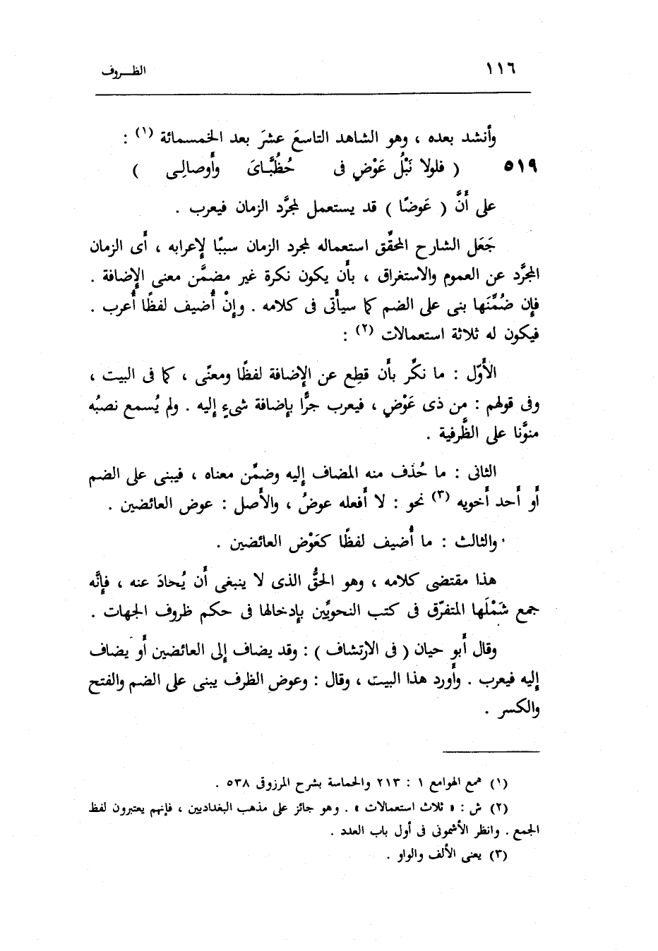 الثَّانِي: مَا حذف مِنْهُ الْمُضَاف إِلَيْهِ وَضمن مَعْنَاهُ فيبني على الضَّم أَو أحد أَخَوَيْهِ نَحْو: لَا أَفعلهُ عوض وَالْأَصْل: عوض العائضين.)
