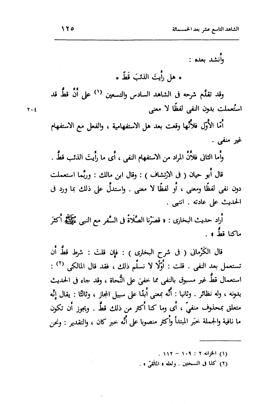 وَقد تقدم شَرحه فِي الشَّاهِد السَّادِس وَالتسْعين على أَن قطّ قد اسْتعْملت بِدُونِ النَّفْي لفظا لَا معنى.