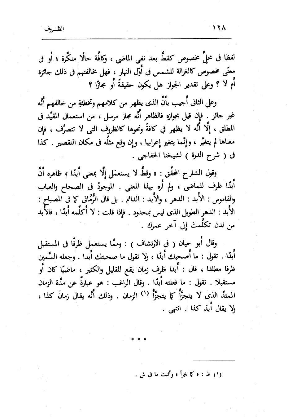وَقَول الشَّارِح الْمُحَقق: وقط لَا يسْتَعْمل إِلَّا بِمَعْنى أبدا ظَاهره أَن أبدا ظرف للماضي وَلم أره بِهَذَا الْمَعْنى. الْمَوْجُود فِي الصِّحَاح والعباب والقاموس: الْأَبَد: الدَّهْر والأبد: الدَّائِم. بل قَالَ الرماني كَمَا فِي الْمِصْبَاح: الْأَبَد: الدَّهْر الطَّوِيل الَّذِي لَيْسَ بمحدود. فَإِذا قلت: لَا ُأكَلِّمهُ أبدا فالأبد من لدن تَكَلَّمت إِلَى آخر عمرك.