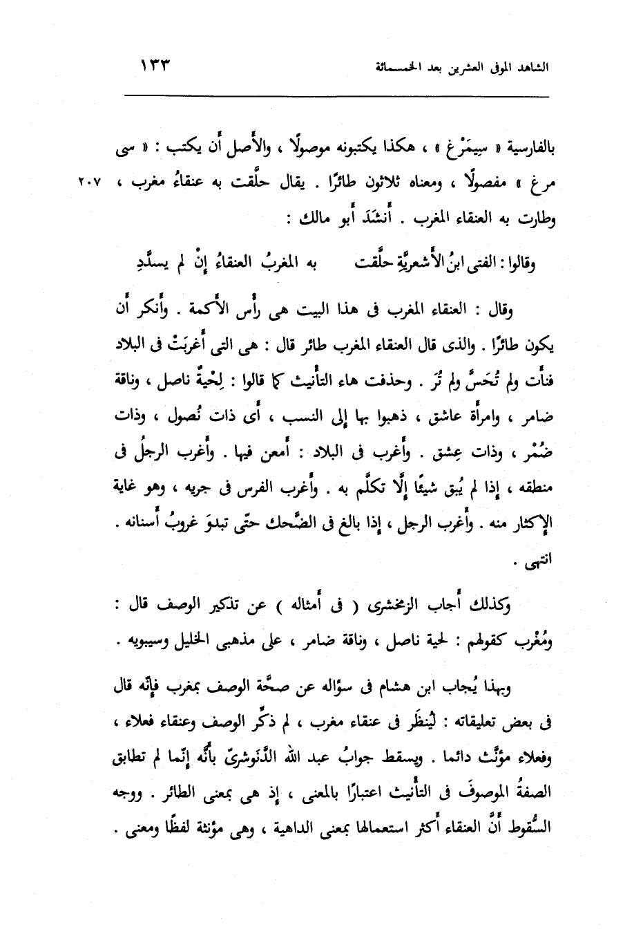 وَبِهَذَا يُجَاب ابْن هِشَام فِي سُؤَاله عَن صِحَة الْوَصْف بمغرب فَإِنَّهُ قَالَ فِي بعض تعليقاته: لينْظر فِي عنقاء مغرب لم ذكر الْوَصْف وعنقاء فعلاء وفعلاء مؤنث دَائِما.