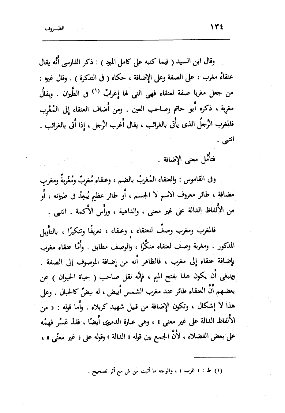 وَقَالَ ابْن السَّيِّد فِيمَا كتبه على كَامِل الْمبرد: ذكر الْفَارِسِي أَنه يُقَال عنقاء مغرب على الصّفة وعَلى الْإِضَافَة حَكَاهُ فِي التَّذْكِرَة.