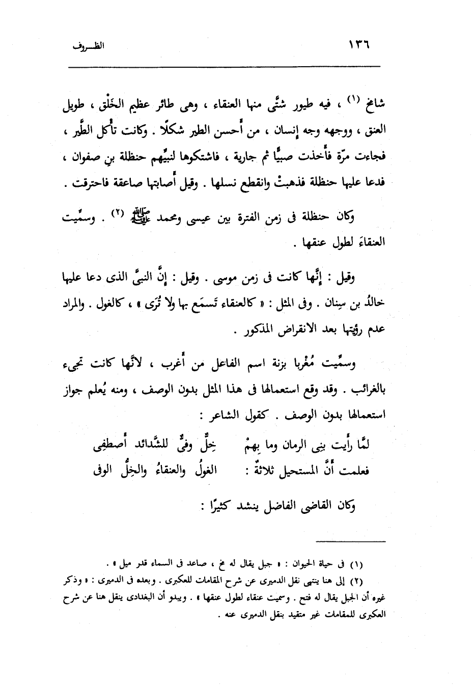 وَكَانَ حَنْظَلَة فِي زمن الفترة بَين عِيسَى وَمُحَمّد صَلَّى اللَّهُ عَلَيْهِ وَسَلَّم َ وَسميت العنقاء لطول عُنُقهَا.