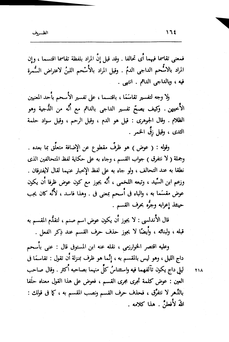 وَعَلِيهِ اقْتصر الْخَوَارِزْمِيّ نَقله عَنهُ ابْن المستوفي قَالَ: عَنى بأسحم داج: اللَّيْل وَهُوَ لَيْسَ بالمقسم بِهِ إِنَّمَا هُوَ ظرف بِمَنْزِلَة أَن تَقول: تقاسما فِي ليلٍ داج يكون تآلفهما فِيهِ واستئناس كل وَقَالَ صَاحب الْعين: عوض كلمة تجْرِي مجْرى الْقسم فعوض على هَذَا القَوْل مَعْنَاهُ حلفا بالدهر لَا نتفرق فَحذف حرف الْقسم وَنصب الْمقسم بِهِ كَمَا فِي قَوْلك: الله لَأَفْعَلَنَّ. هَذَا كَلَامه.