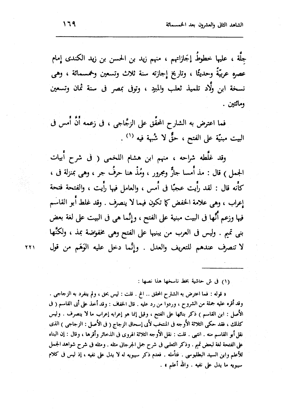 وَقد غلطه شراحه مِنْهُم ابْن هِشَام اللَّخْمِيّ فِي شرح أَبْيَات الْجمل قَالَ: مذ أمسا جَار ومجرور ومذ هُنَا حرف جر وَهِي بِمَنْزِلَة فِي كَأَنَّهُ قَالَ: لقد رَأَيْت عجبا فِي أمس وَالْعَامِل وَقد غلط أَبُو الْقَاسِم فِيهَا وَزعم أَنَّهَا فِي الْبَيْت مَبْنِيَّة على الْفَتْح وَإِنَّمَا هِيَ فِي الْبَيْت على لُغَة بعض بني تَمِيم. وَلَيْسَ فِي الْعَرَب من يبنيها على الْفَتْح وَهِي مخفوضة بمذ وَلكنهَا لَا تَنْصَرِف عِنْدهم للتعريف وَالْعدْل.