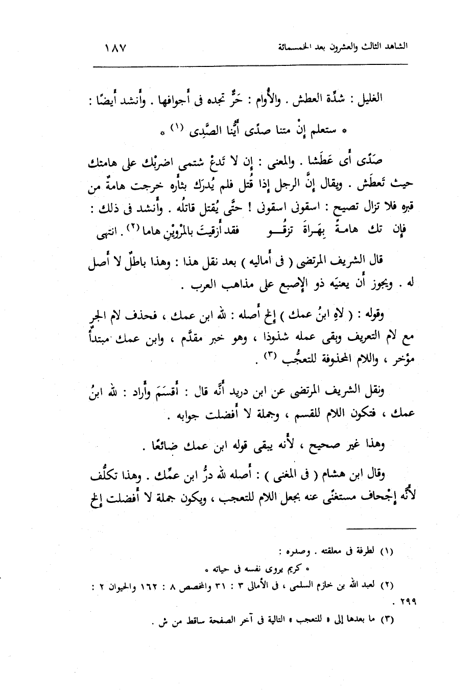 الغليل: شدَّة الْعَطش. والأوام: حر تَجدهُ فِي أجوافها. وَأنْشد أَيْضا: الطَّوِيل ستعلم إِن متْنا صدًى أَيّنَا الصدي صدًى أَي: عطشاً. وَالْمعْنَى: إِن لَا تدع شتمي اضربك على هامتك حَيْثُ تعطش. وَيُقَال: إِن الرجل إِذا قتل فَلم يدْرك بثأره خرجت هامةٌ من قَبره فَلَا تزَال تصيح: اسقوني اسقوني وَأنْشد فِي ذَلِك: الوافر