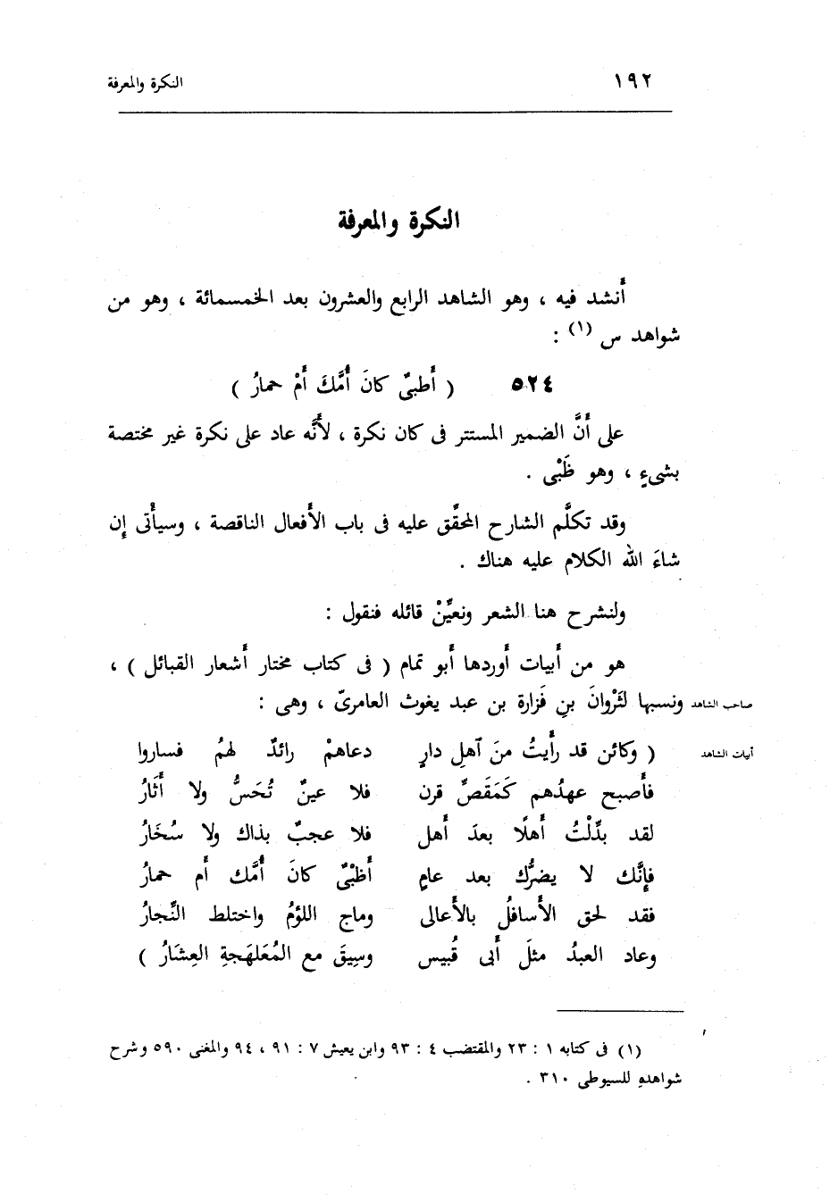 وَهُوَ من شَوَاهِد س: الوافر أظبيٌ كَانَ أمك أم حمَار على أَن الضَّمِير الْمُسْتَتر فِي كَانَ نكرَة لِأَنَّهُ عَاد على نكرَة غير مُخْتَصَّة بشيءٍ وَهُوَ ظَبْي.