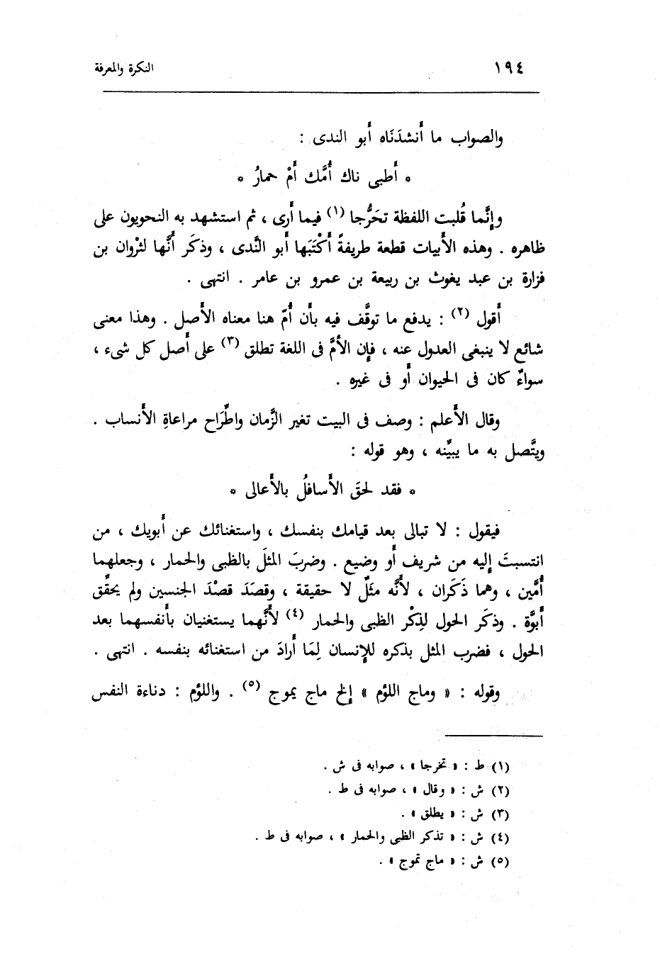 وَالصَّوَاب مَا أنشدناه أَبُو الندى: أظبي ناك أمك أم حمَار وَإِنَّمَا قلبت اللَّفْظَة تحرجاً فِيمَا أرى ثمَّ اسْتشْهد بِهِ النحويون على ظَاهره. وَهَذِه الأبيات قِطْعَة طريفةً أَكتبهَا أَبُو الندى وَذكر أَنَّهَا لثروان بن فَزَارَة بن عبد يَغُوث بن ربيعَة بن عَمْرو بن عَامر.