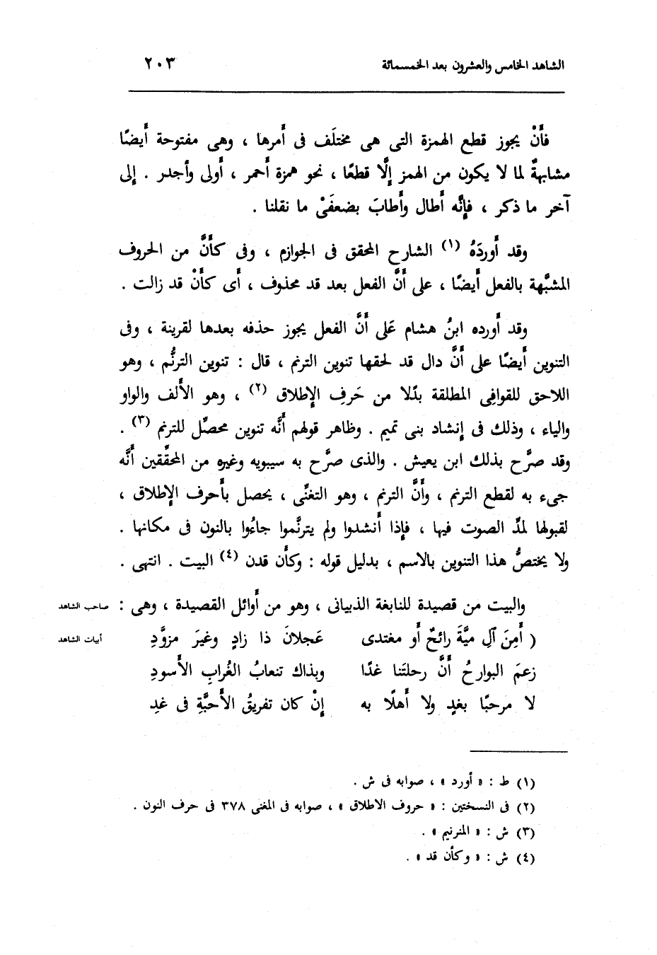 وَقد أوردهُ ابْن هِشَام على أَن الْفِعْل يجوز حذفه بعْدهَا لقَرِينَة وَفِي التَّنْوِين أَيْضا على أَن دَال قد لحقها تَنْوِين الترنم قَالَ: تَنْوِين الترنم وَهُوَ اللَّاحِق للقوافي الْمُطلقَة بَدَلا من حرف الْإِطْلَاق وَهُوَ الْألف وَالْوَاو وَالْيَاء وَذَلِكَ فِي إنشاد بني تَمِيم.