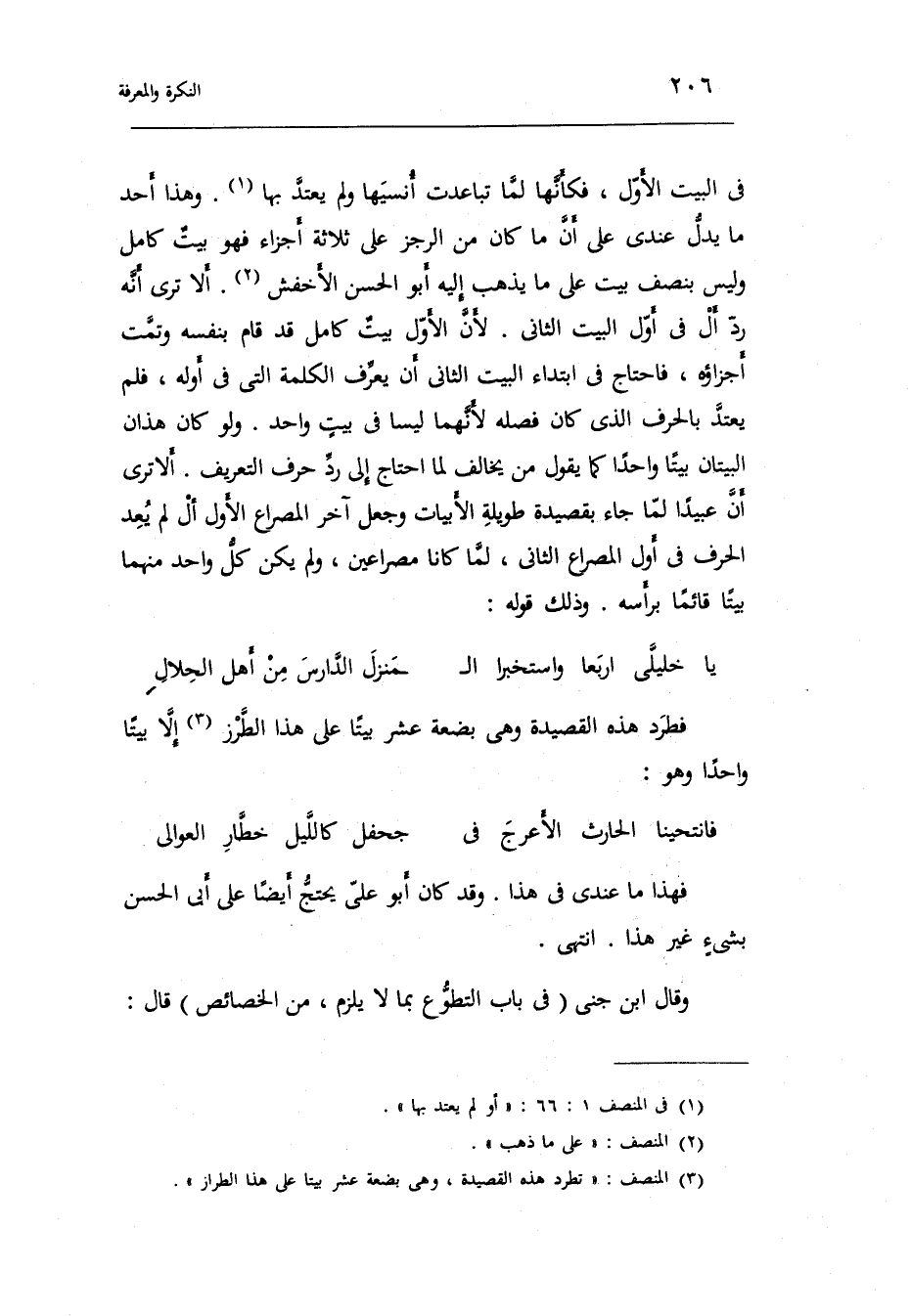 فِي الْبَيْت الأول فَكَأَنَّهَا لما تَبَاعَدت أنسيها وَلم يعْتد بهَا. وَهَذَا أحد مَا يدل عِنْدِي على أَن مَا كَانَ من الرجز على ثَلَاثَة أَلا ترى أَنه رد أل فِي أول الْبَيْت الثَّانِي. لِأَن الأول بيتٌ كَامِل قد قَامَ بِنَفسِهِ وتمت أجزاؤه فَاحْتَاجَ فِي ابْتِدَاء الْبَيْت الثَّانِي أَن يعرف الْكَلِمَة الَّتِي فِي أَوله فَلم يعْتد بالحرف الَّذِي كَانَ فَصله لِأَنَّهُمَا ليسَا فِي بيتٍ وَاحِد.