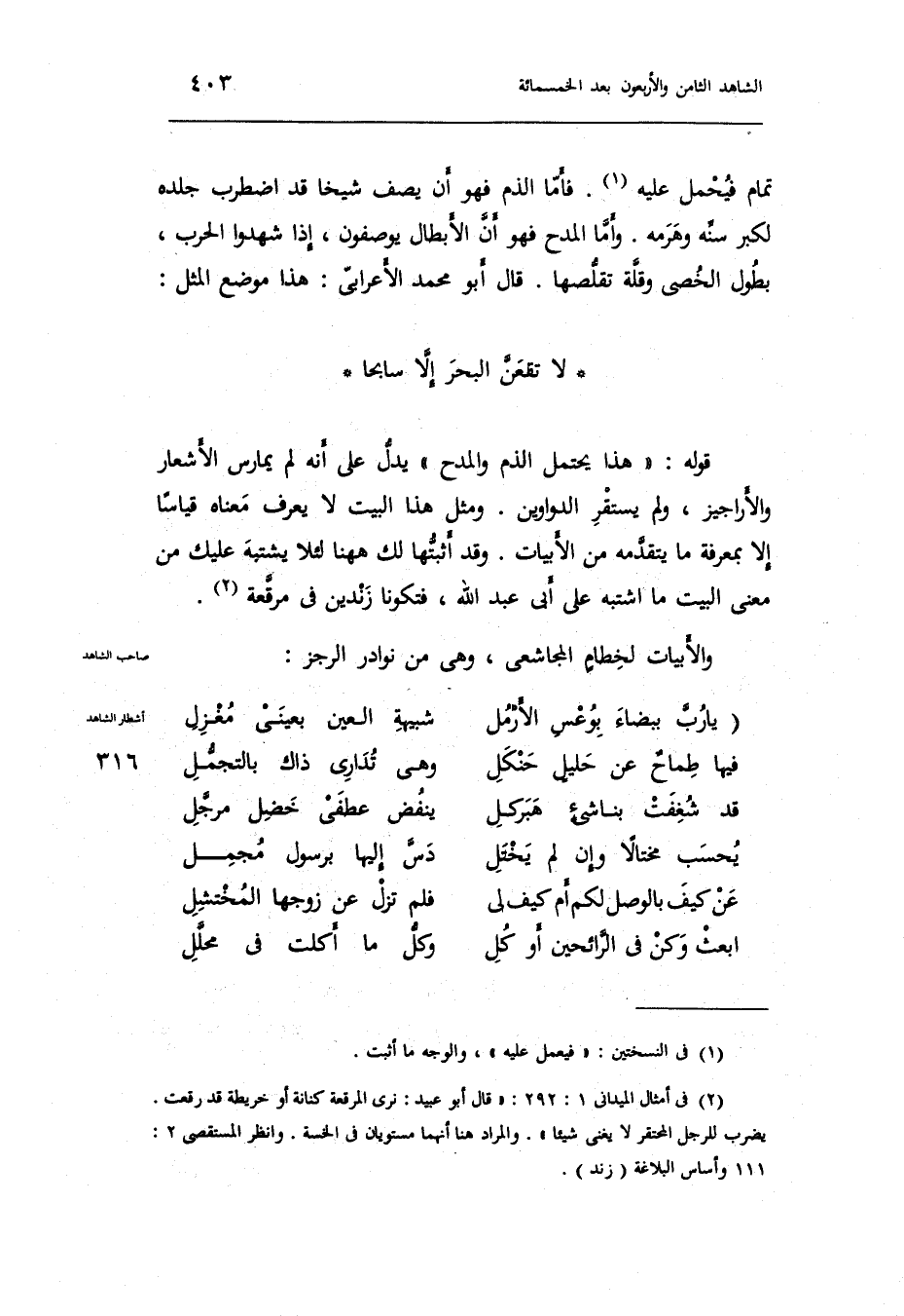 فَأَما الذَّم فَهُوَ أَن يصف شَيخا قد اضْطربَ جلده لكبر سنه وهرمه. وَأما الْمَدْح فَهُوَ أَن هَذَا مَوضِع الْمثل: لَا تقعن الْبَحْر إِلَّا سابحاً قَوْله: هَذَا يحْتَمل الذَّم والمدح يدل على أَنه لم يمارس الْأَشْعَار والأراجيز وَلم يسْتَقرّ الدَّوَاوِين. وَمثل هَذَا الْبَيْت لَا يعرف مَعْنَاهُ قِيَاسا إِلَّا بِمَعْرِِفَة مَا يتقدمه من