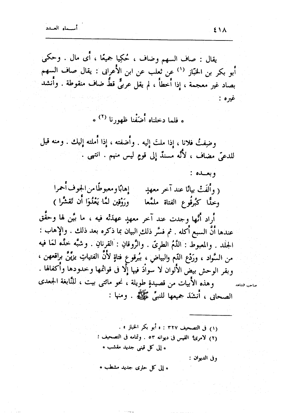 وَأنْشد غَيره: فَلَمَّا دخلناه أضفنا ظُهُورنَا وضفت فلَانا إِذا ملت عَلَيْهِ. وأضفته إِذا أملته إِلَيْك. وَمِنْه قيل: للدعي مُضَاف لِأَنَّهُ مسندٌ إِلَى قومٍ لَيْسَ مِنْهُم. انْتهى.