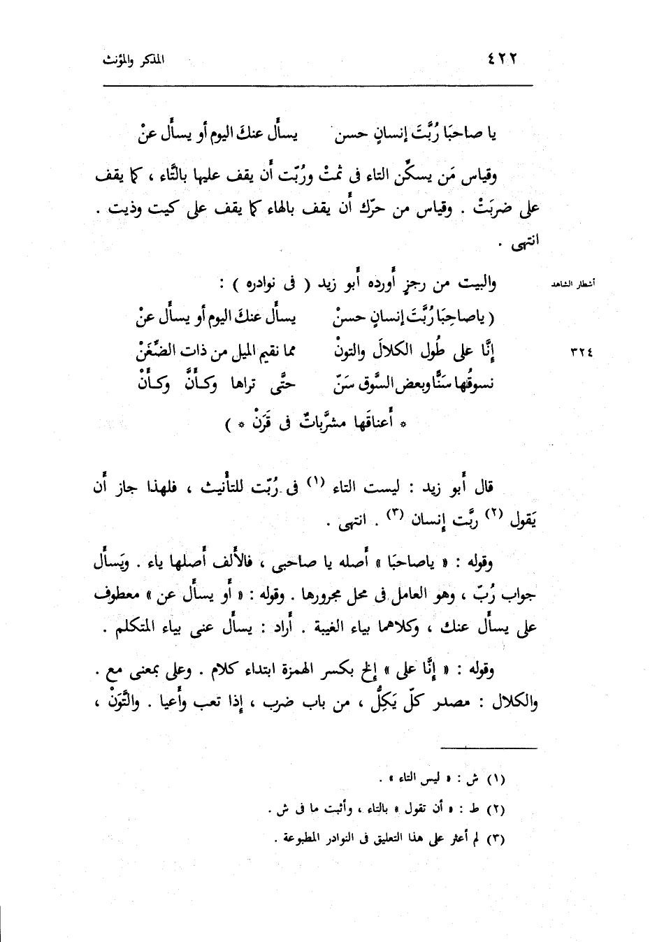 أعناقها مشرباتٌ فِي قرن قَالَ أَبُو زيد: لَيست التَّاء فِي ربت للتأنيث فَلهَذَا جَازَ أَن تَقول ربت إِنْسَان. انْتهى.