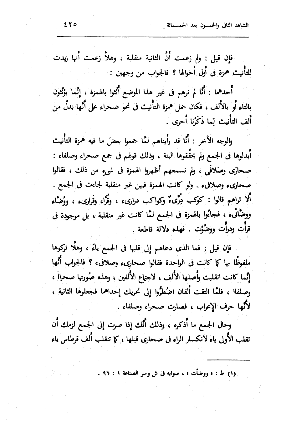 فَإِن قيل: فَمَا الَّذِي دعاهم إِلَى قَلبهَا فِي الْجمع يَاء وهلا تركوها ملفوظاً بهَا كَمَا كَانَت فِي الْوَاحِدَة فَقَالُوا: صحاريء وصلافيء فَالْجَوَاب أَنَّهَا إِنَّمَا كَانَت انقلبت وَأَصلهَا الْألف لِاجْتِمَاع الْأَلفَيْنِ وَهَذِه صورتهَا صحراا وصلفاا فَلَمَّا الْتَقت أَلفَانِ اضطروا إِلَى تَحْرِيك إِحْدَاهمَا)